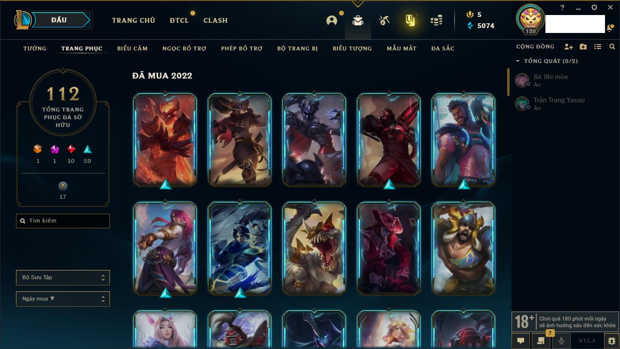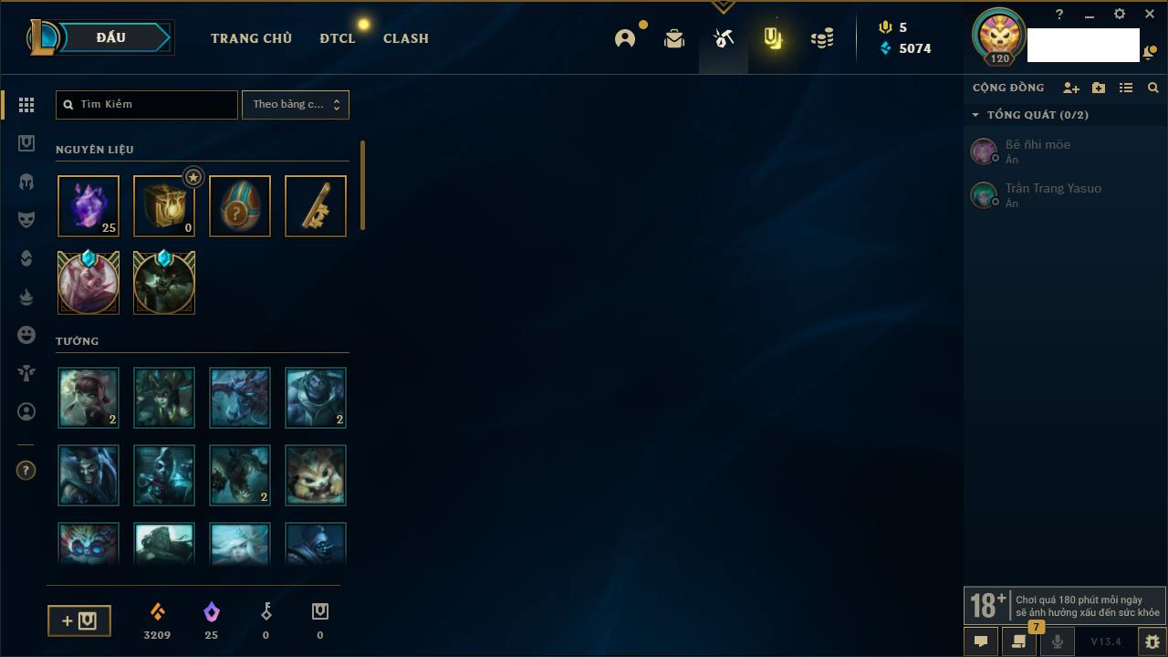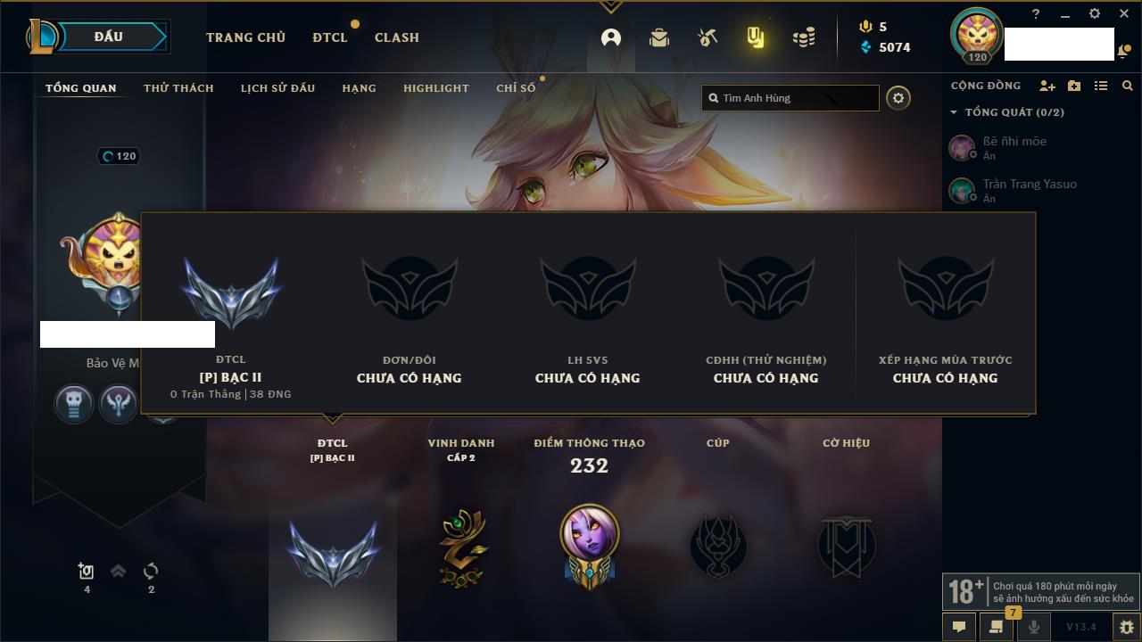 Rank Đơn: Chưa RankKhung: Chưa có khungTướng: 162 - Còn 23234 THXTrang Phục: 150Rank ĐTCL: Chưa RankLinh Thú: 42