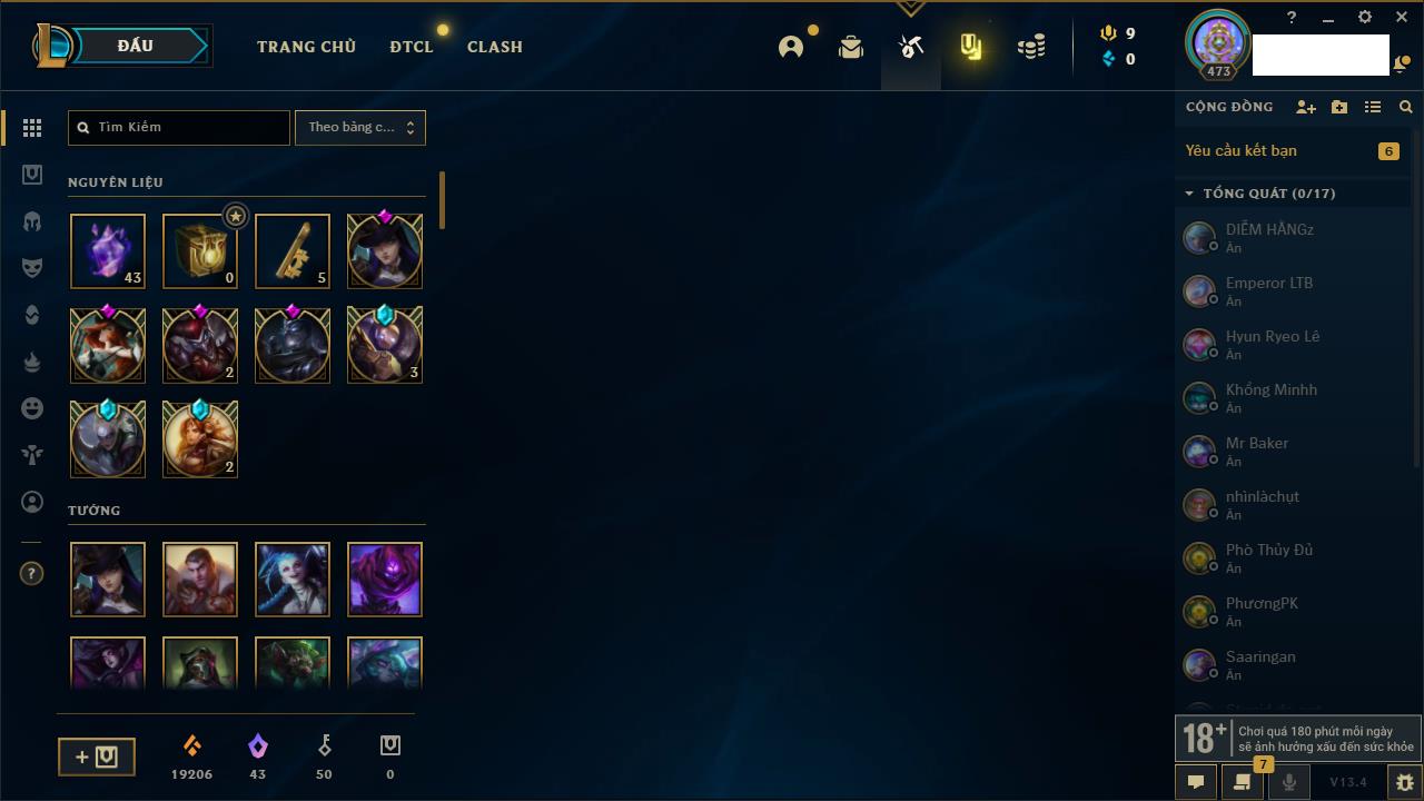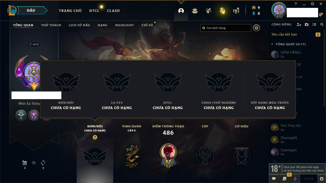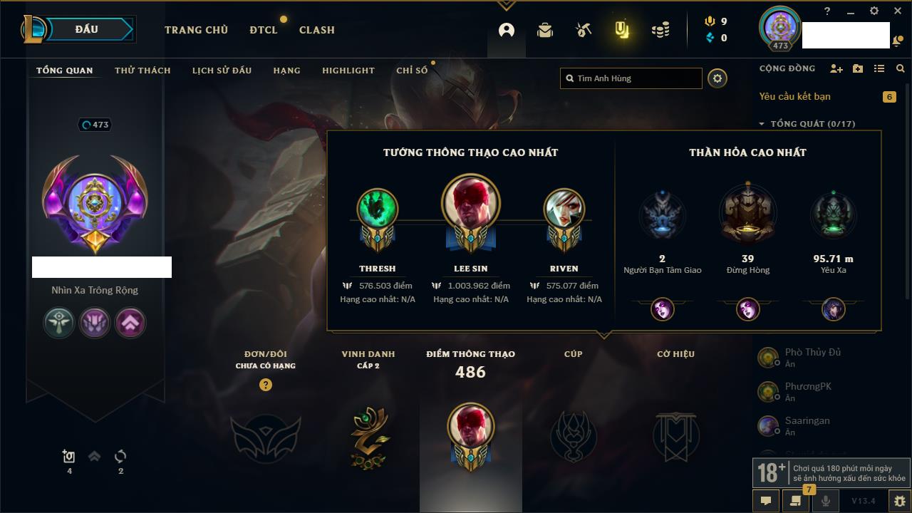 Rank Đơn: Vàng IVKhung: BạcTướng: 171 - Còn 426239 THXTrang Phục: 162Rank ĐTCL: Chưa RankLinh Thú: 33