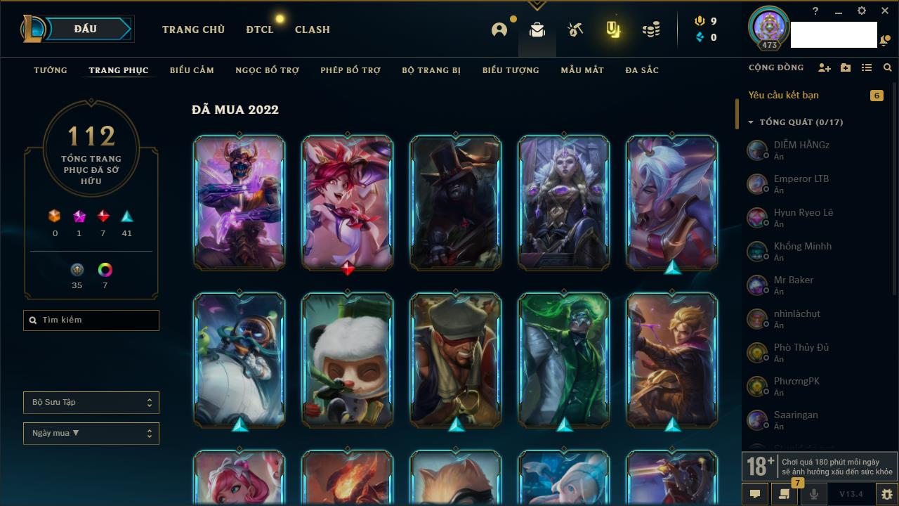 Rank Đơn: Vàng IVKhung: VàngTướng: 171 - Còn 48721 THXTrang Phục: 171Rank ĐTCL: Chưa RankLinh Thú: 27