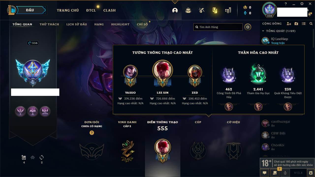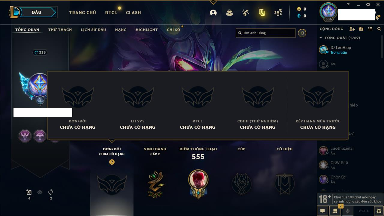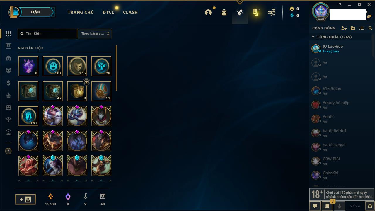 Rank Đơn: Đồng IIKhung: Chưa có khungTướng: 170 - Còn 56487 THXTrang Phục: 90Rank ĐTCL: Chưa RankLinh Thú: 129