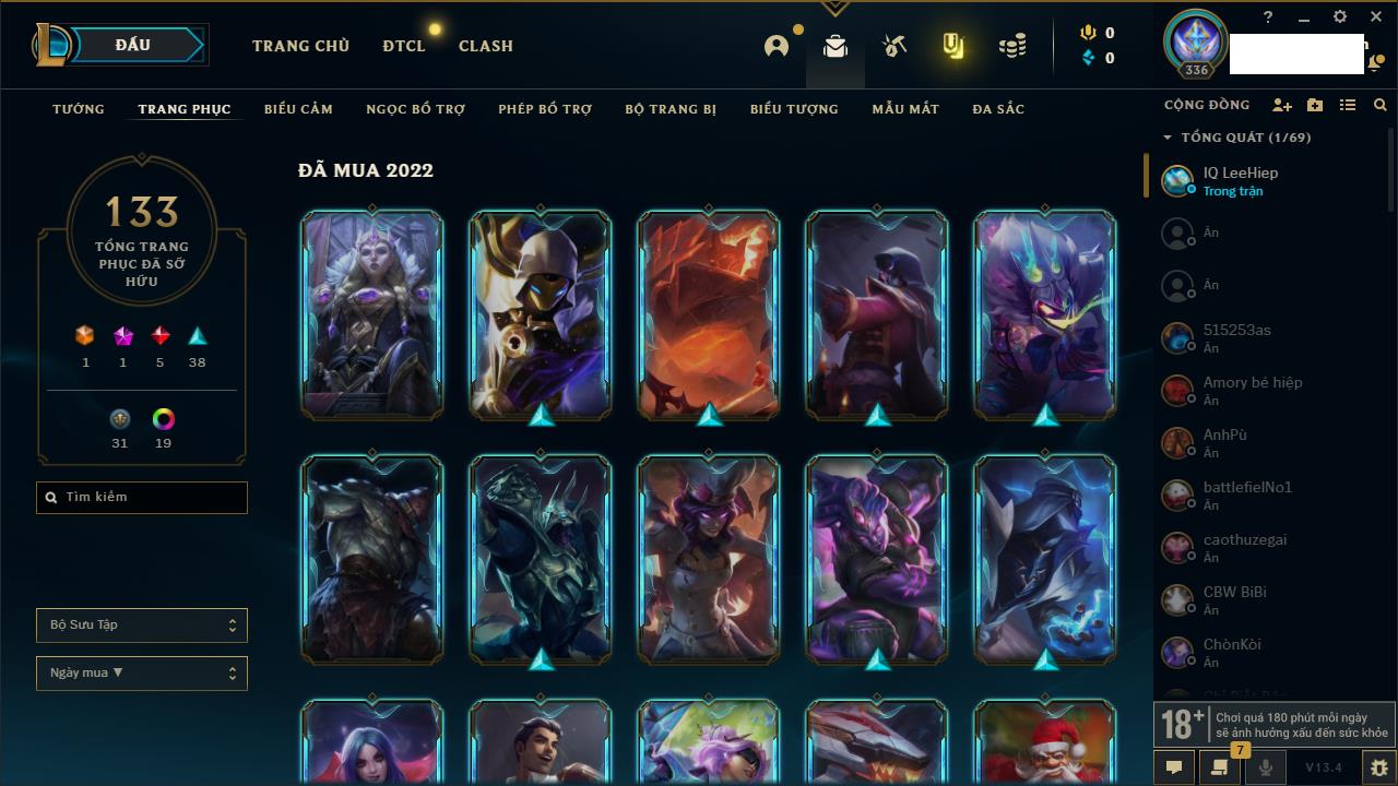 Rank Đơn: Vàng IIIKhung: VàngTướng: 170 - Còn 33222 THXTrang Phục: 136Rank ĐTCL: Chưa RankLinh Thú: 40