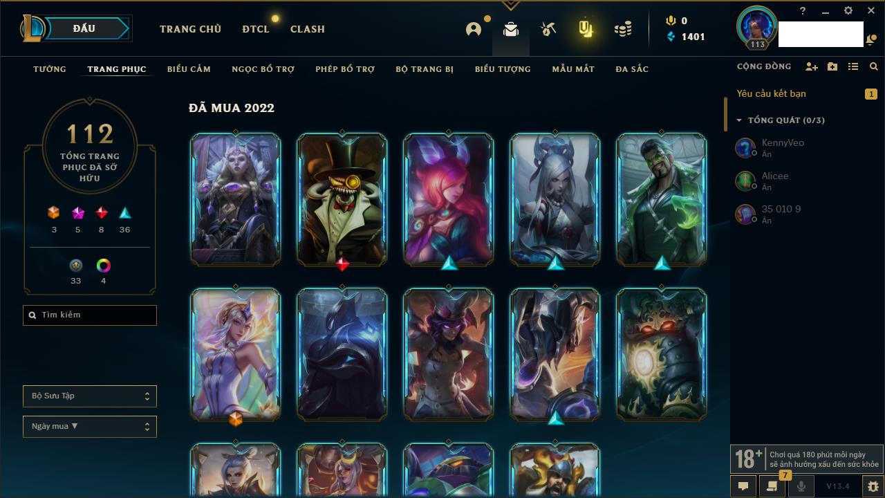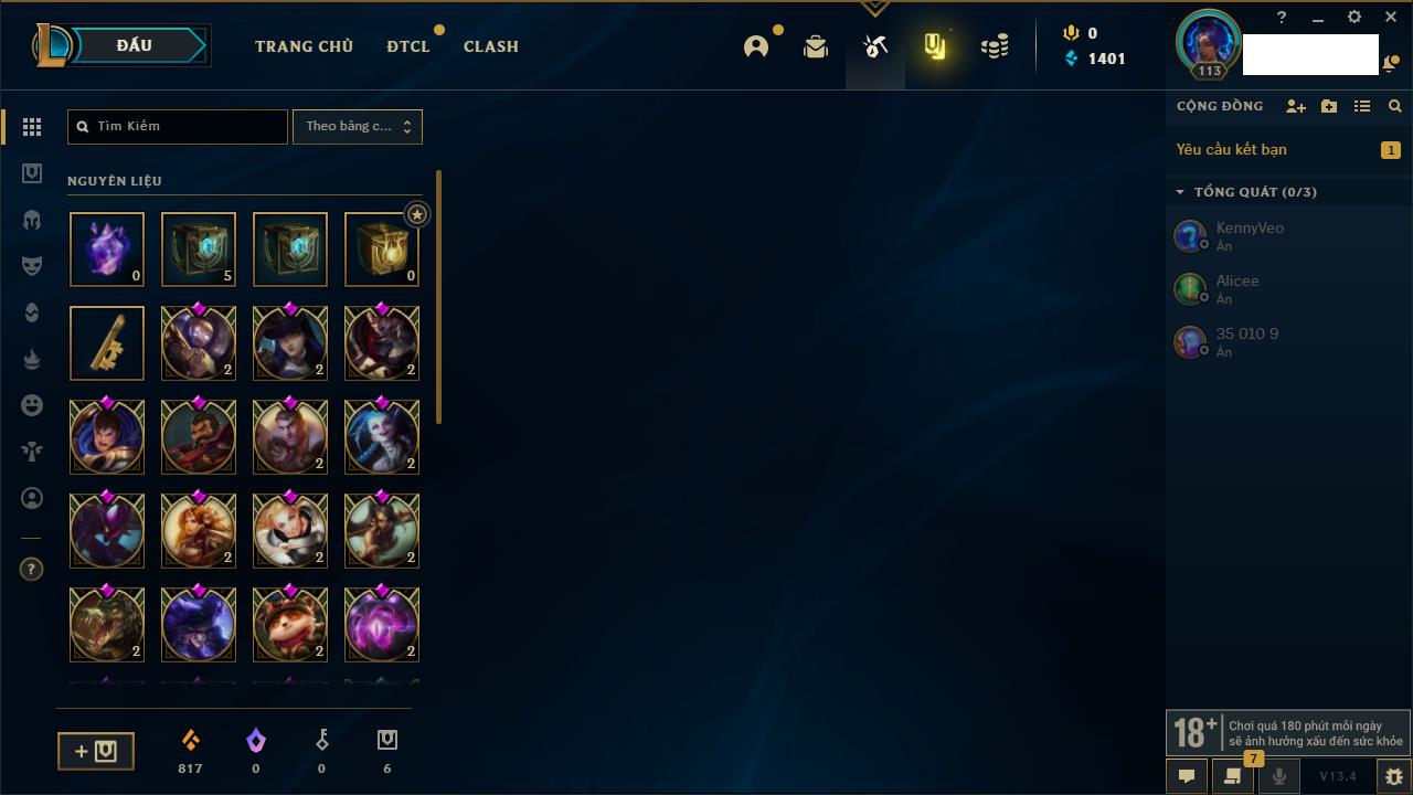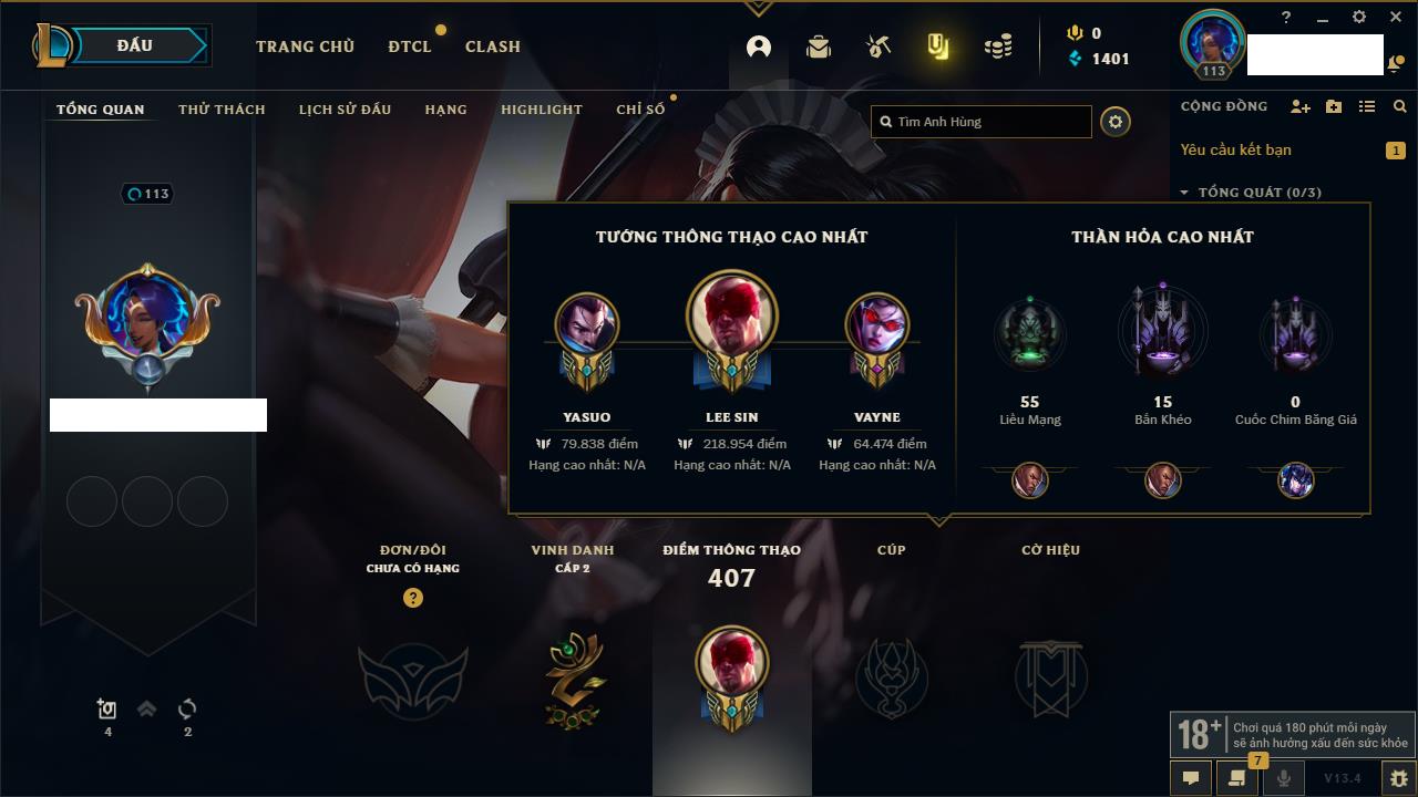 Rank Đơn: Vàng IVKhung: BạcTướng: 171 - Còn 426239 THXTrang Phục: 162Rank ĐTCL: Chưa RankLinh Thú: 33