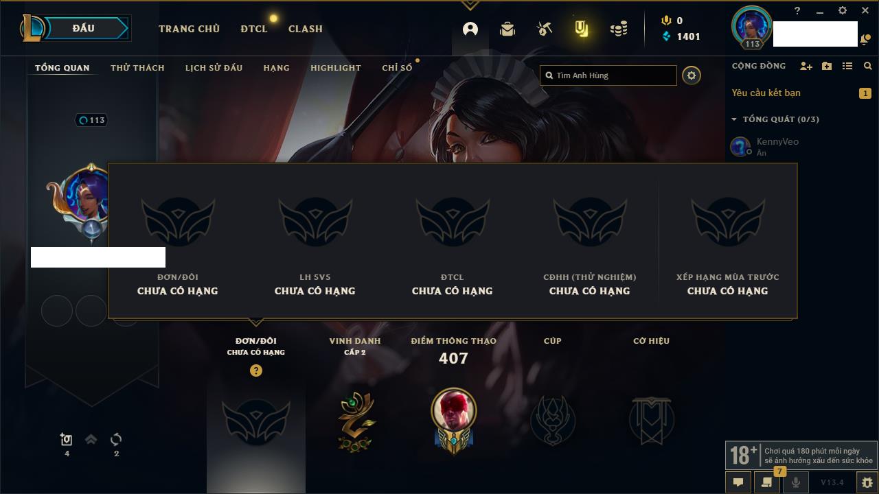 Rank Đơn: Vàng IVKhung: VàngTướng: 171 - Còn 48721 THXTrang Phục: 171Rank ĐTCL: Chưa RankLinh Thú: 27