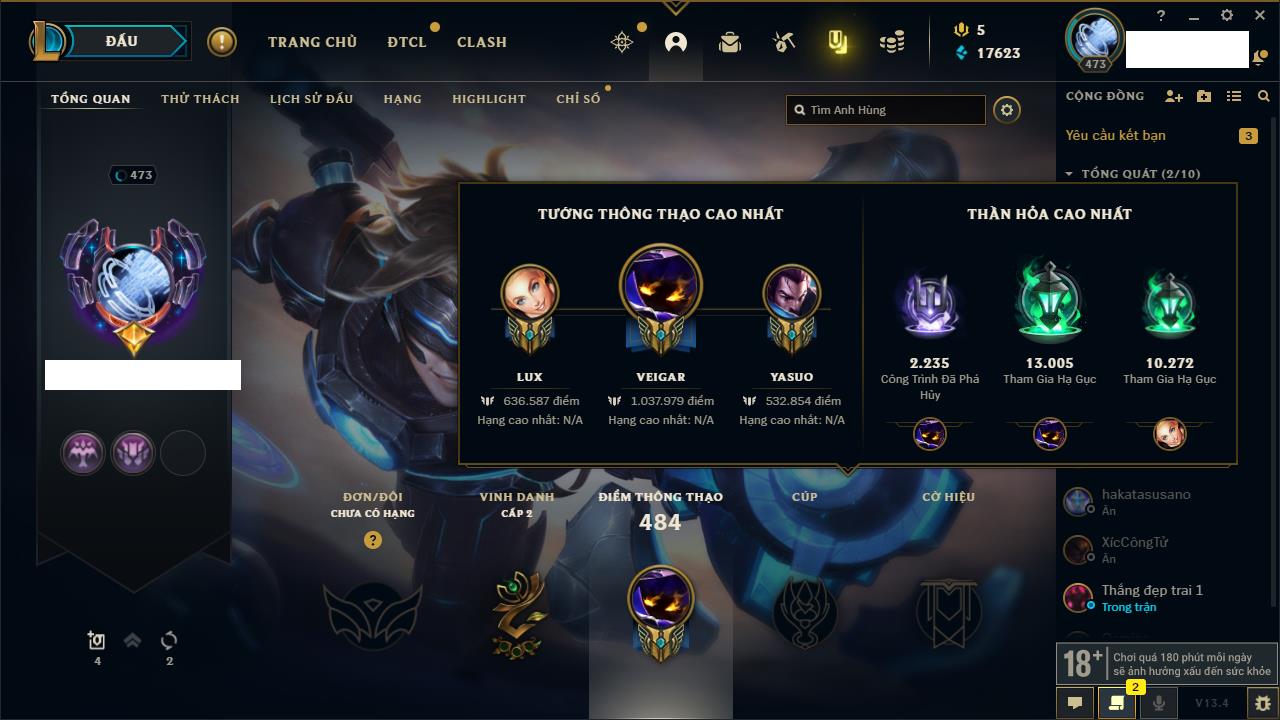 Rank Đơn: Vàng IVKhung: VàngTướng: 171 - Còn 48721 THXTrang Phục: 171Rank ĐTCL: Chưa RankLinh Thú: 27