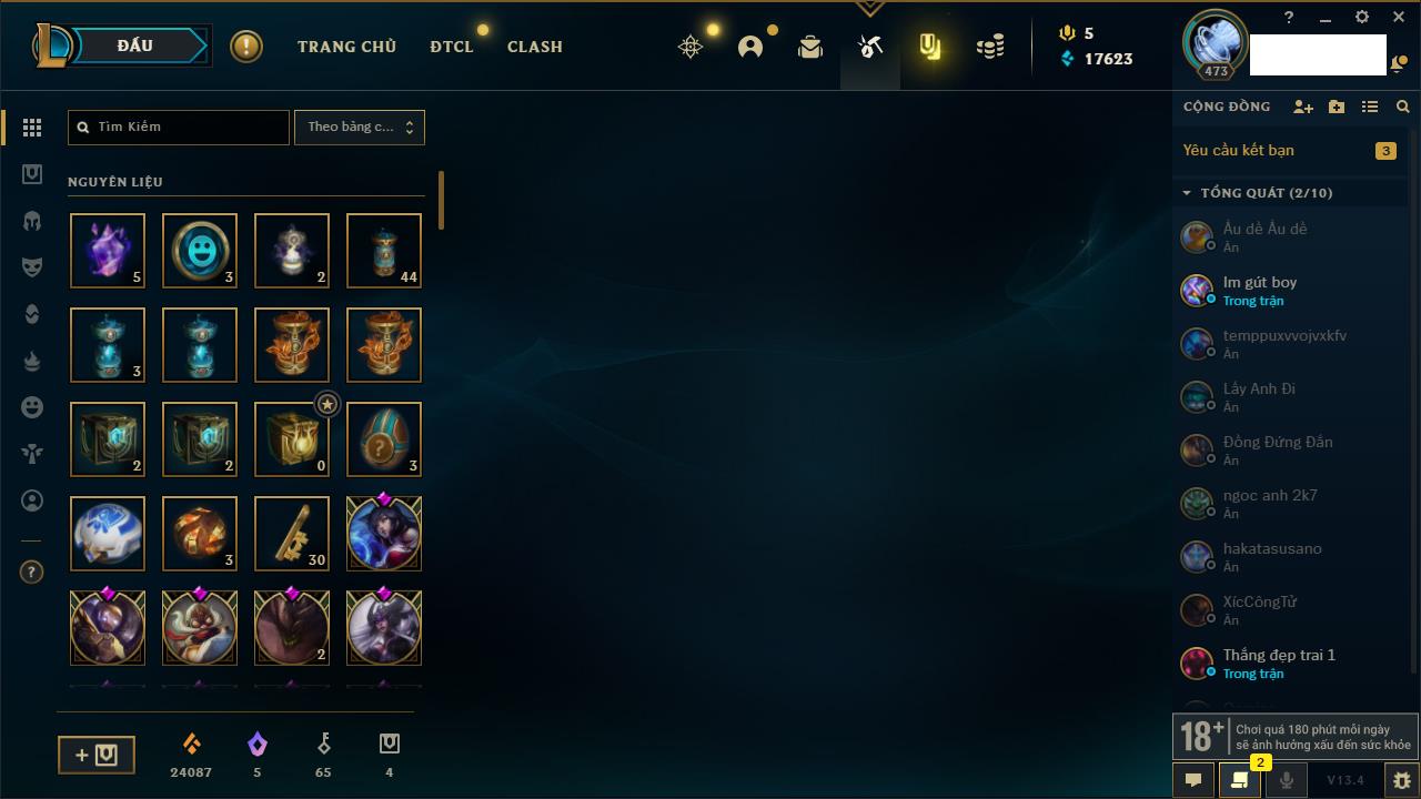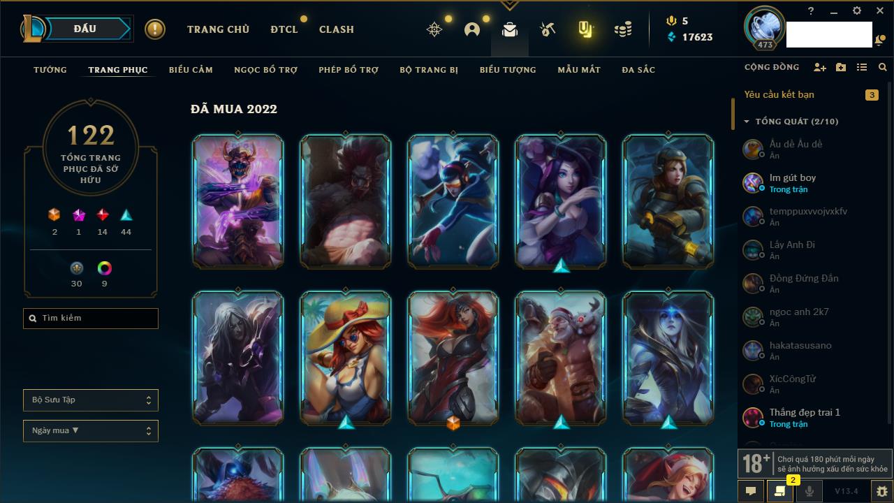 Rank Đơn: Bạc IVKhung: VàngTướng: 172 - Còn 358384 THXTrang Phục: 177Rank ĐTCL: Lục Bảo IILinh Thú: 211
