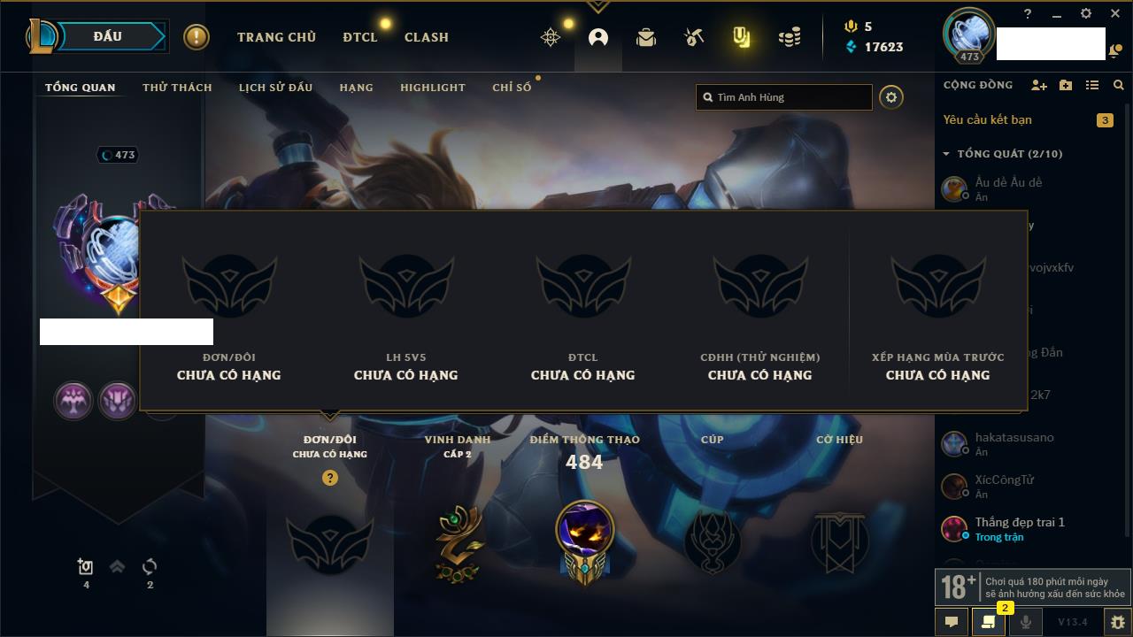 Rank Đơn: Sắt IKhung: SắtTướng: 171 - Còn 125789 THXTrang Phục: 151Rank ĐTCL: Đồng IIILinh Thú: 72