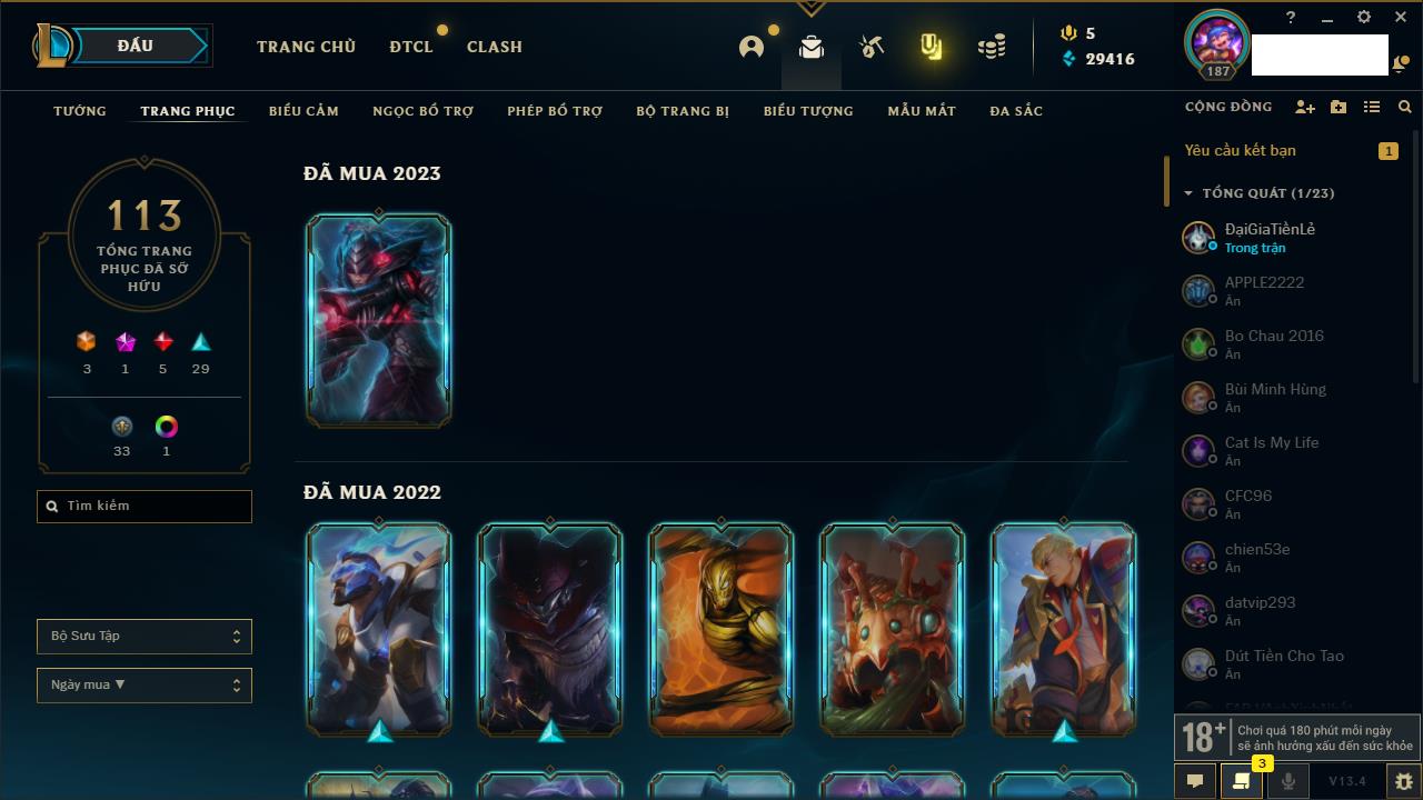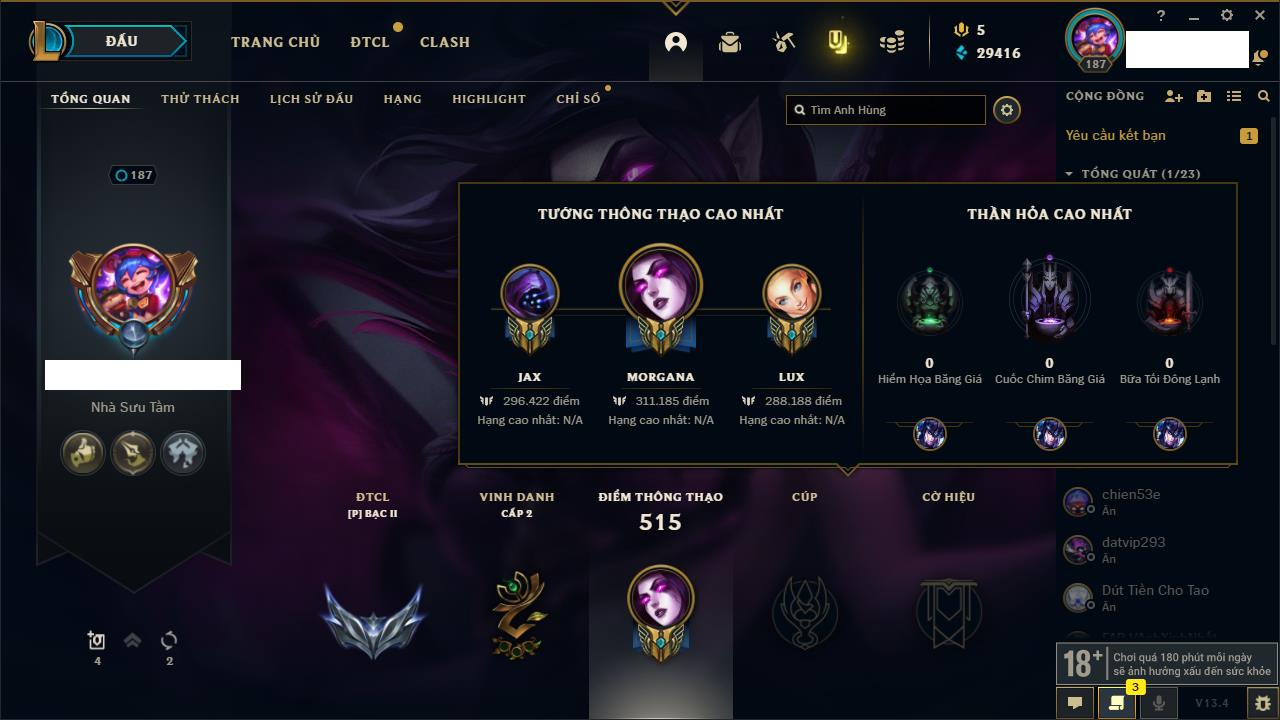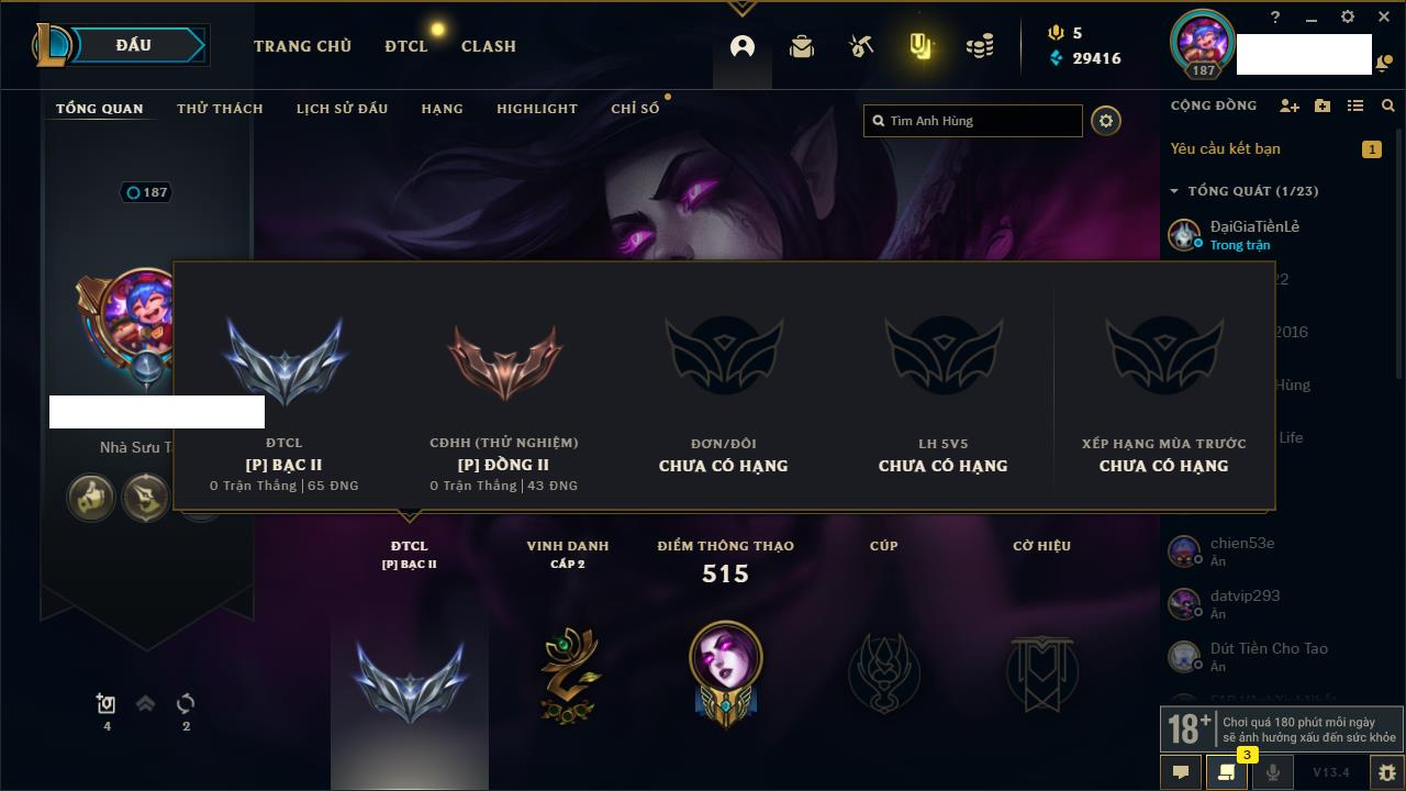 Rank Đơn: Chưa rank mùa nàoKhung: Chưa có khungTướng: 3 - Còn 34550 THXTrang Phục: 0Rank ĐTCL: Bạch Kim IVLinh Thú: 41