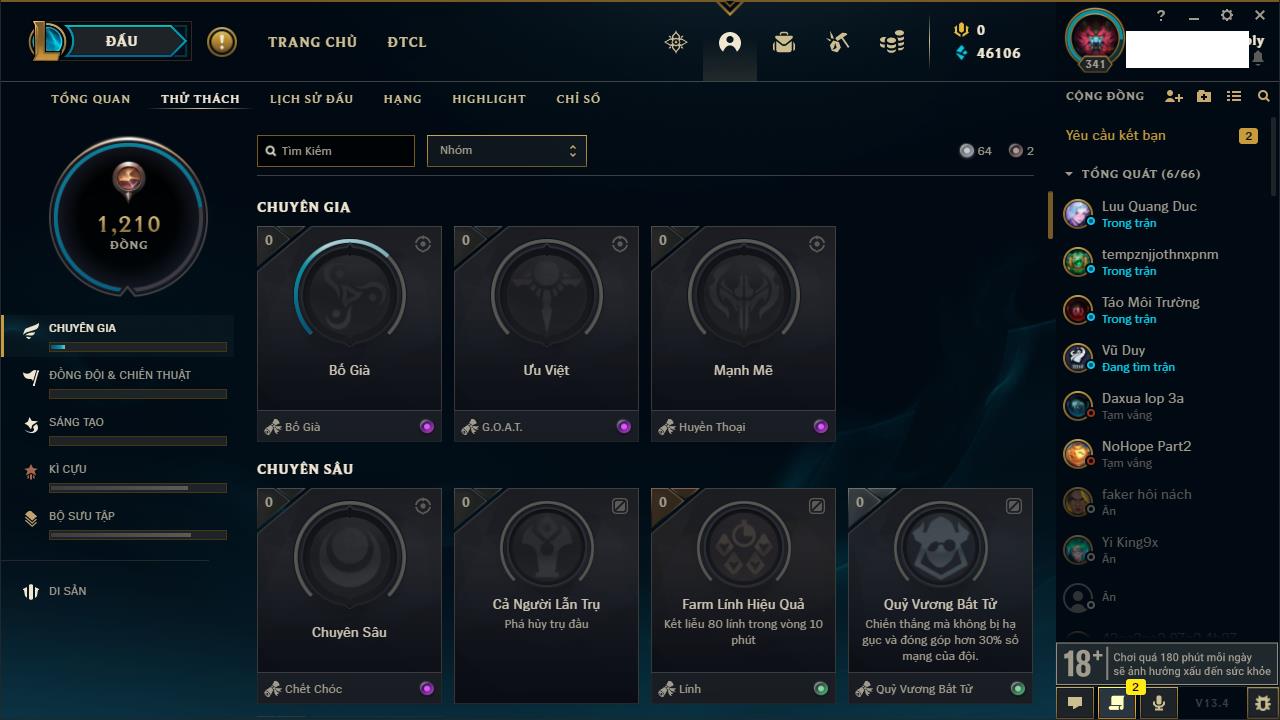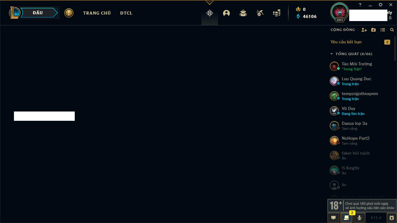 Rank Đơn: Đồng IIKhung: Chưa có khungTướng: 170 - Còn 56487 THXTrang Phục: 90Rank ĐTCL: Chưa RankLinh Thú: 129