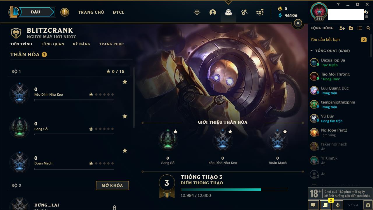 Rank Đơn: Chưa RankKhung: Chưa có khungTướng: 168 - Còn 70824 THXTrang Phục: 155Rank ĐTCL: Chưa RankLinh Thú: 53