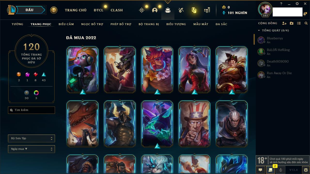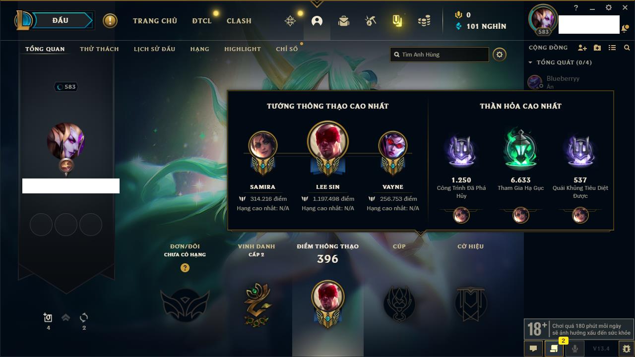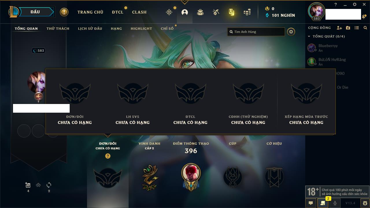 Rank Đơn: Vàng IVKhung: VàngTướng: 171 - Còn 48721 THXTrang Phục: 171Rank ĐTCL: Chưa RankLinh Thú: 27
