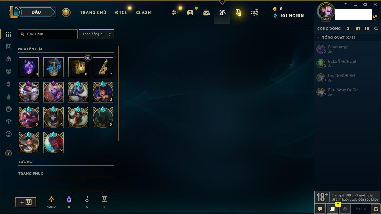 Rank Đơn: Bạc IIKhung: VàngTướng: 171 - Còn 332462 THXTrang Phục: 165Rank ĐTCL: Kim Cương IVLinh Thú: 181