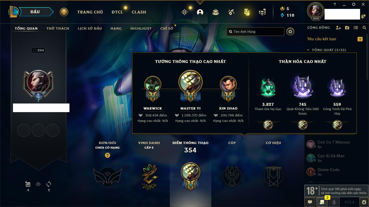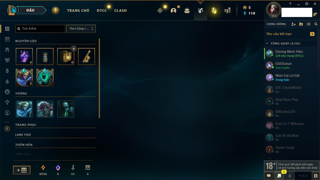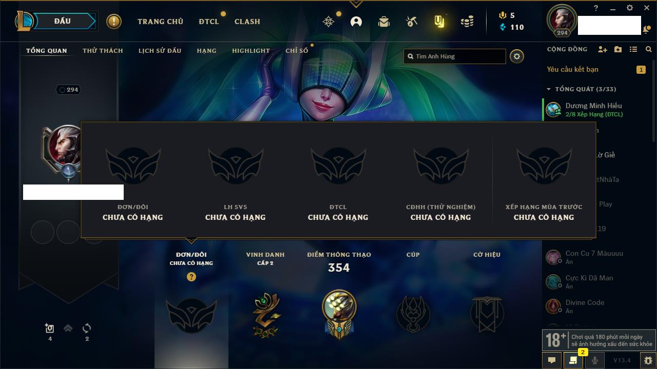 Rank Đơn: Vàng IVKhung: BạcTướng: 171 - Còn 231097 THXTrang Phục: 180Rank ĐTCL: Vàng IVLinh Thú: 110
