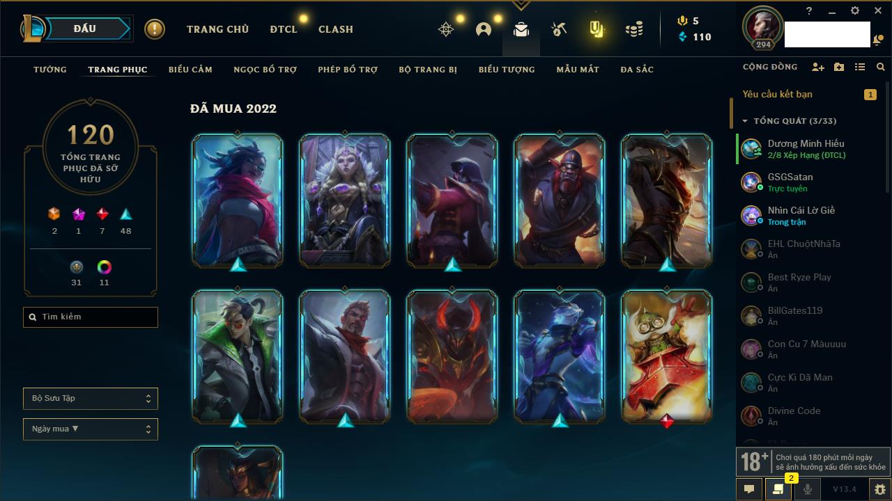 Rank Đơn: Vàng IVKhung: VàngTướng: 171 - Còn 48721 THXTrang Phục: 171Rank ĐTCL: Chưa RankLinh Thú: 27