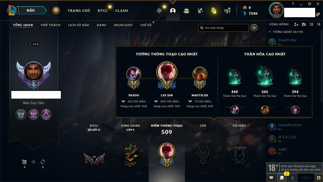 Rank Đơn: Chưa RankKhung: Chưa có khungTướng: 163 - Còn 157403 THXTrang Phục: 149Rank ĐTCL: Chưa RankLinh Thú: 122