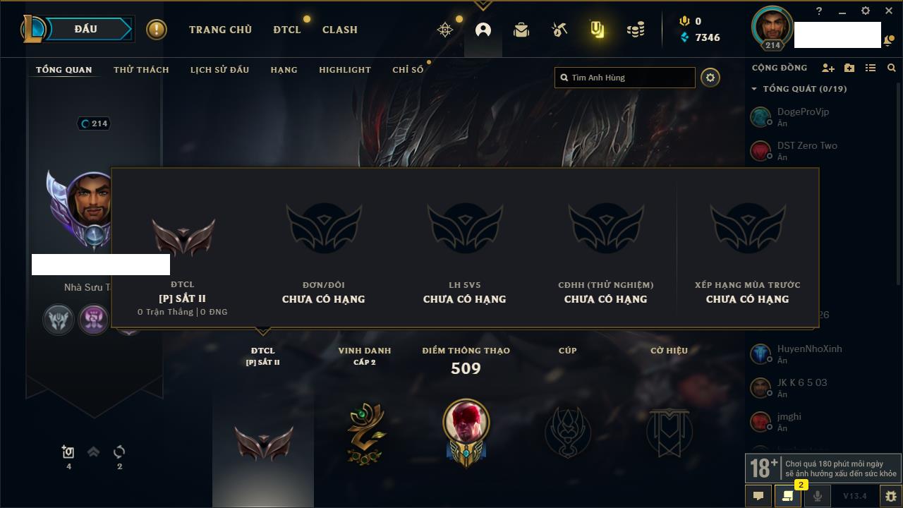 Rank Đơn: Chưa RankKhung: BạcTướng: 141 - Còn 299 THXTrang Phục: 101Rank ĐTCL: Chưa RankLinh Thú: 84