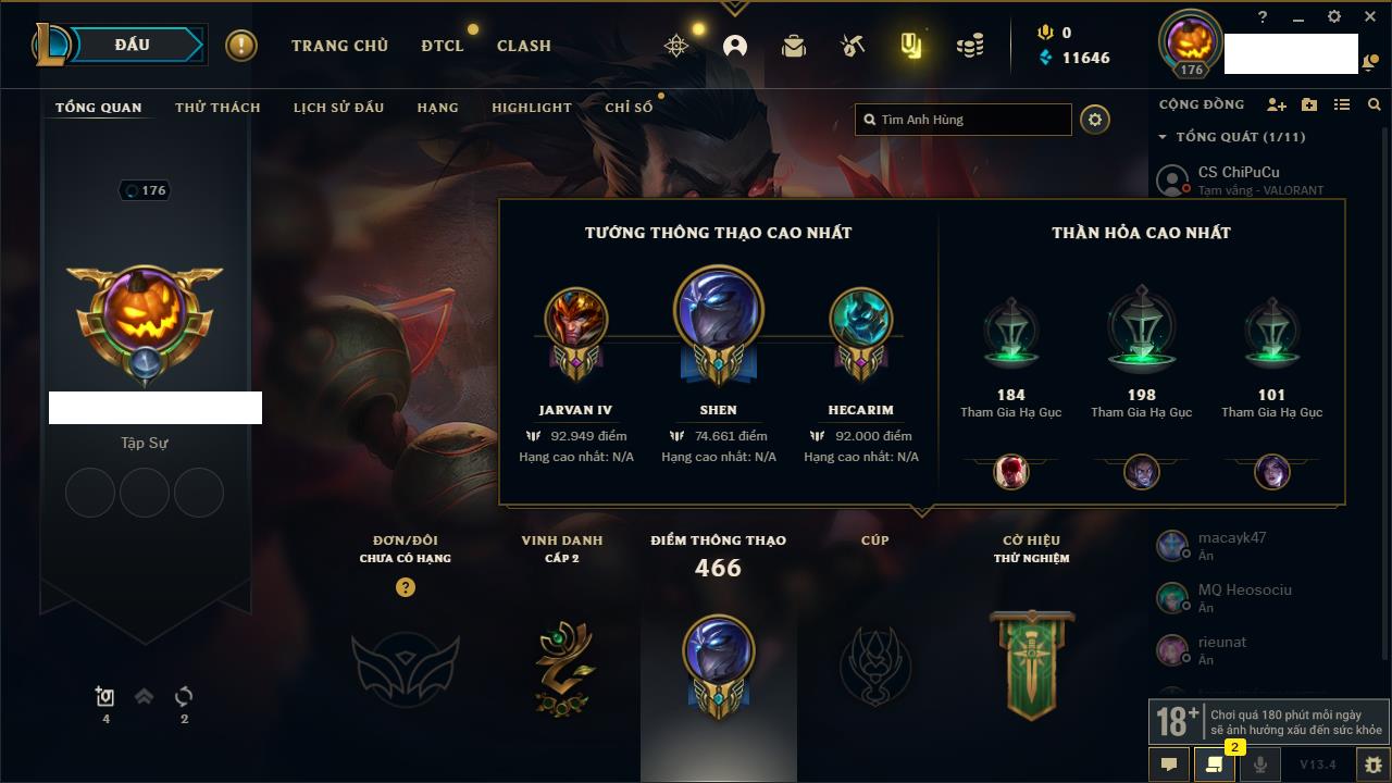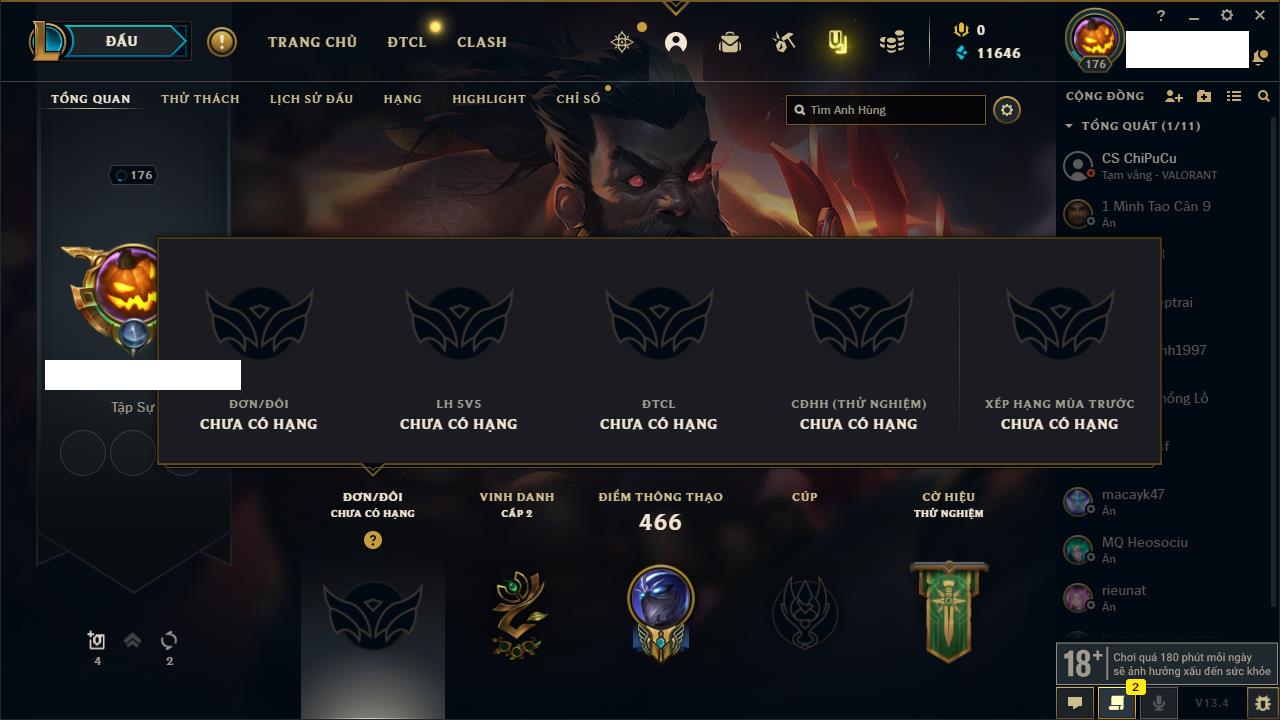 Rank Đơn: Chưa RankKhung: Chưa có khungTướng: 154 - Còn 18477 THXTrang Phục: 127Rank ĐTCL: Vàng ILinh Thú: 183