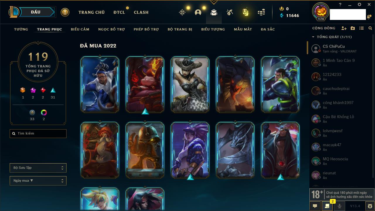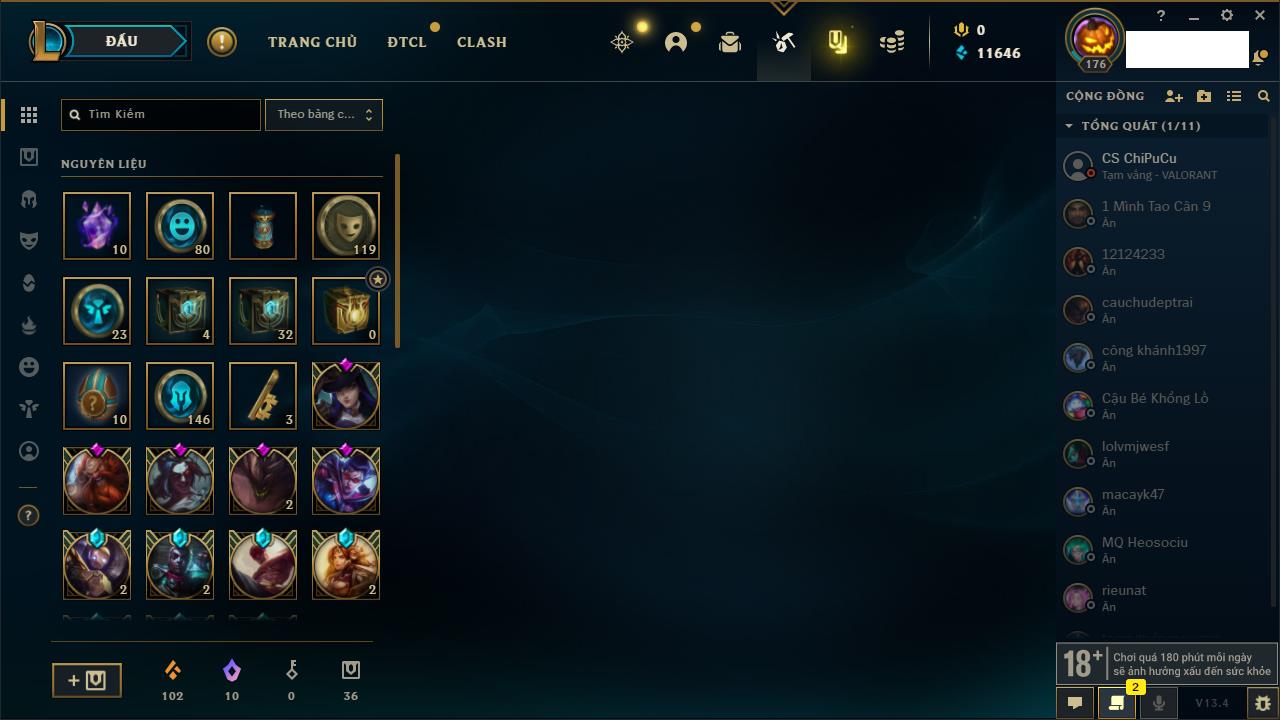 Rank Đơn: Chưa RankKhung: Chưa có khungTướng: 163 - Còn 157403 THXTrang Phục: 149Rank ĐTCL: Chưa RankLinh Thú: 122