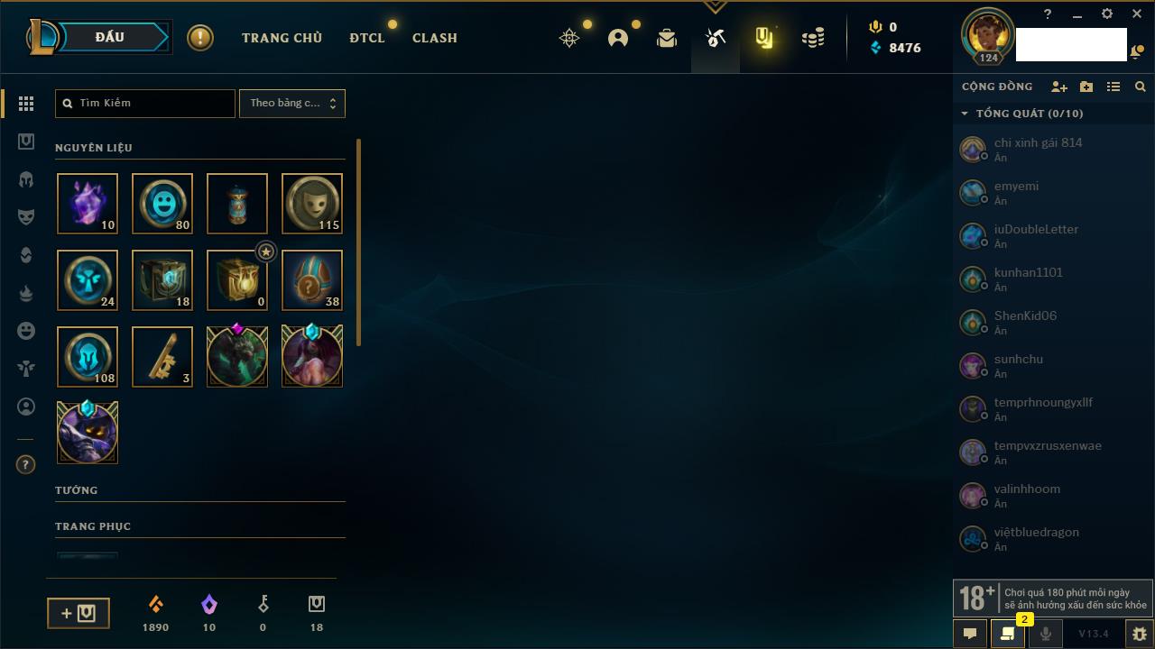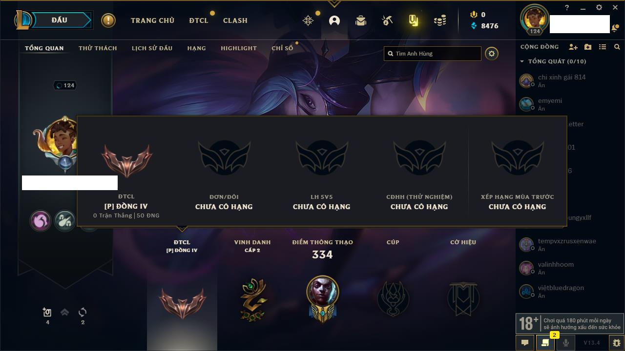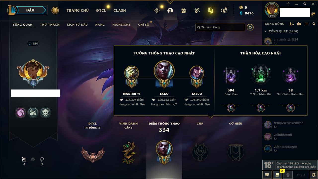 Rank Đơn: Bạc IIIKhung: Chưa có khungTướng: 171 - Còn 21493 THXTrang Phục: 252Rank ĐTCL: Bạch Kim IVLinh Thú: 123