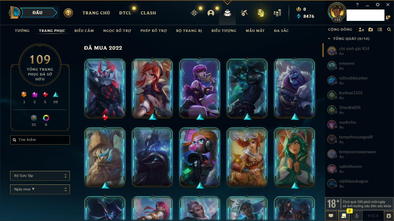 Rank Đơn: Vàng IIIKhung: VàngTướng: 161 - Còn 162202 THXTrang Phục: 179Rank ĐTCL: Chưa RankLinh Thú: 20
