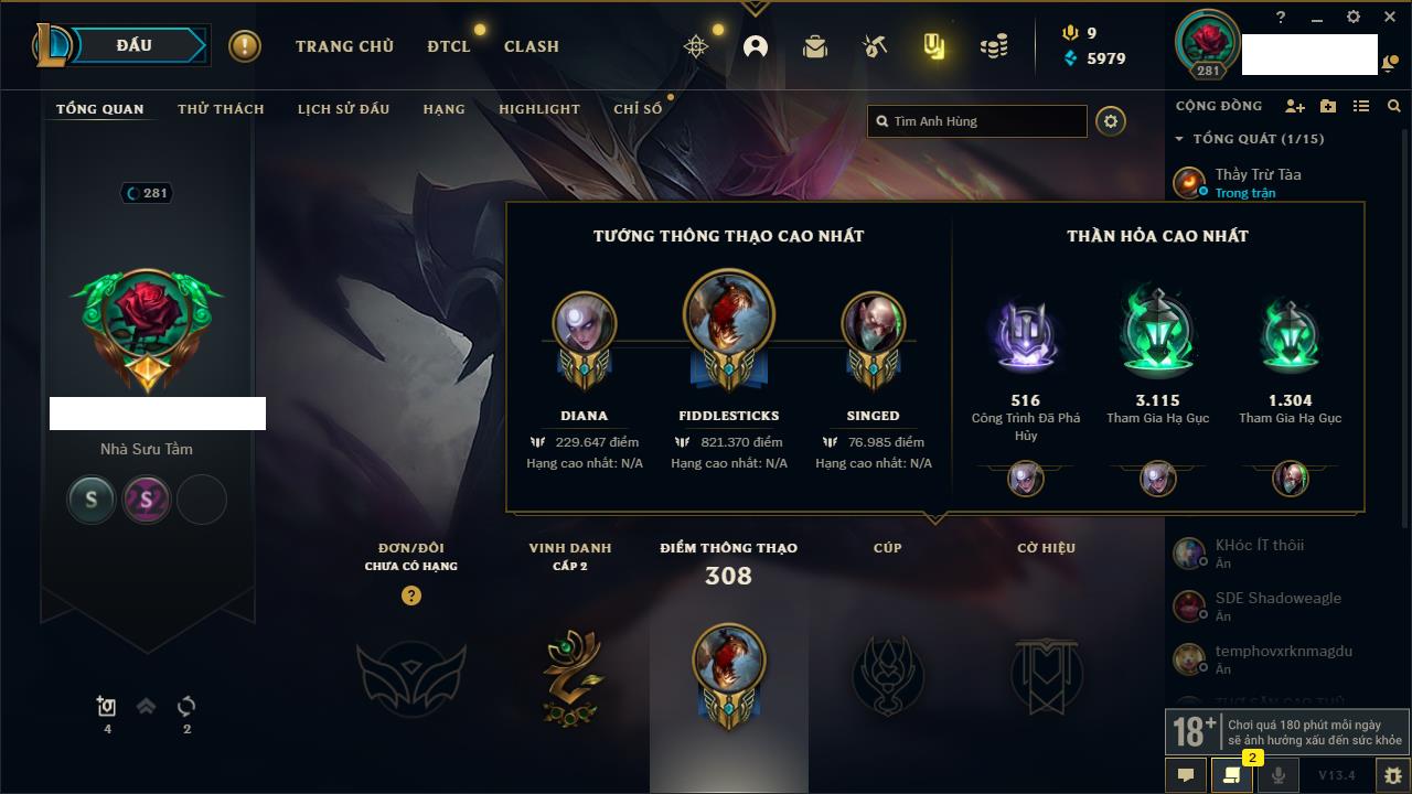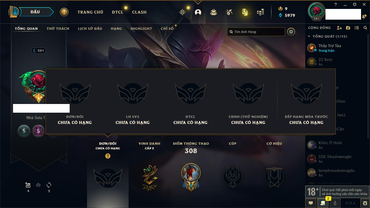 Rank Đơn: Chưa RankKhung: Chưa có khungTướng: 154 - Còn 18477 THXTrang Phục: 127Rank ĐTCL: Vàng ILinh Thú: 183