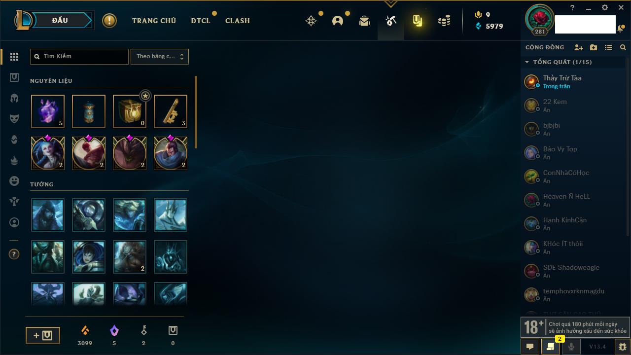 Rank Đơn: Chưa RankKhung: Chưa có khungTướng: 162 - Còn 23234 THXTrang Phục: 150Rank ĐTCL: Chưa RankLinh Thú: 42