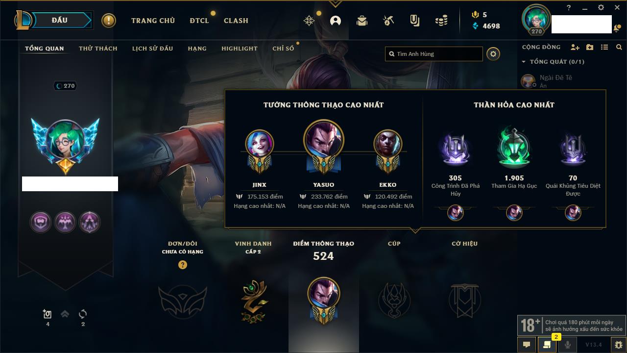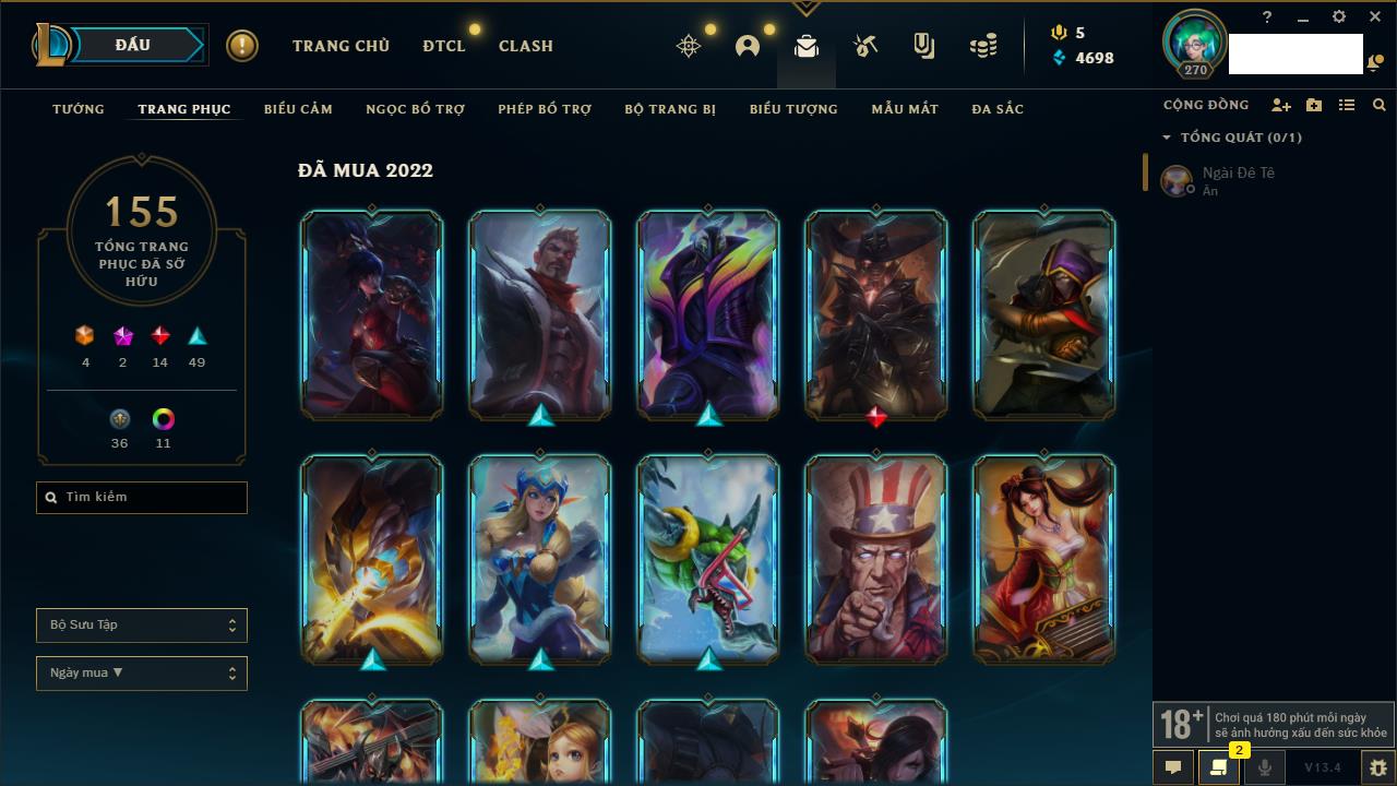 Rank Đơn: Chưa RankKhung: Chưa có khungTướng: 154 - Còn 18477 THXTrang Phục: 127Rank ĐTCL: Vàng ILinh Thú: 183