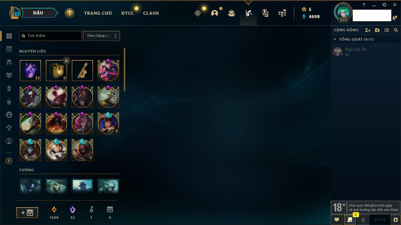 Rank Đơn: Chưa rank mùa nàoKhung: Chưa có khungTướng: 0 - Còn 2000 THXTrang Phục: 0Rank ĐTCL: Chưa RankLinh Thú: 14