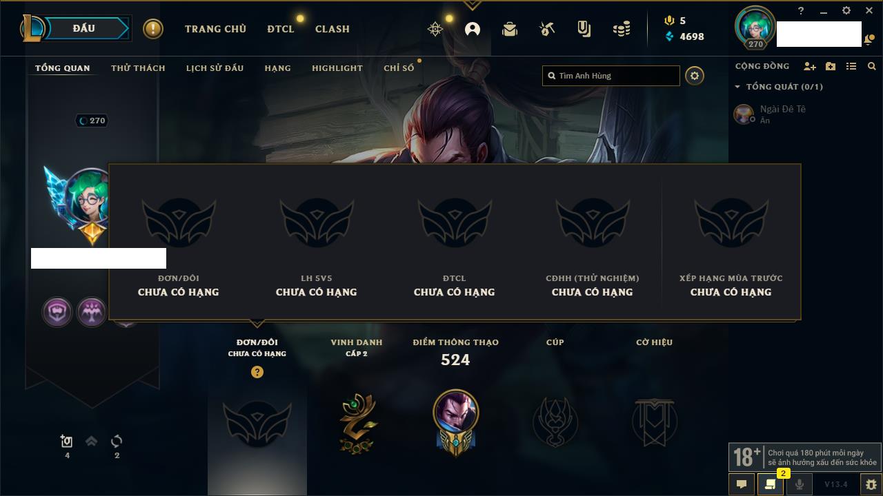 Rank Đơn: Chưa RankKhung: Chưa có khungTướng: 162 - Còn 23234 THXTrang Phục: 150Rank ĐTCL: Chưa RankLinh Thú: 42