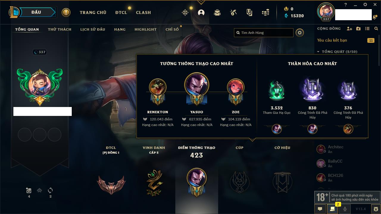 Rank Đơn: Đồng IKhung: ĐồngTướng: 168 - Còn 11447 THXTrang Phục: 245Rank ĐTCL: Chưa RankLinh Thú: 53