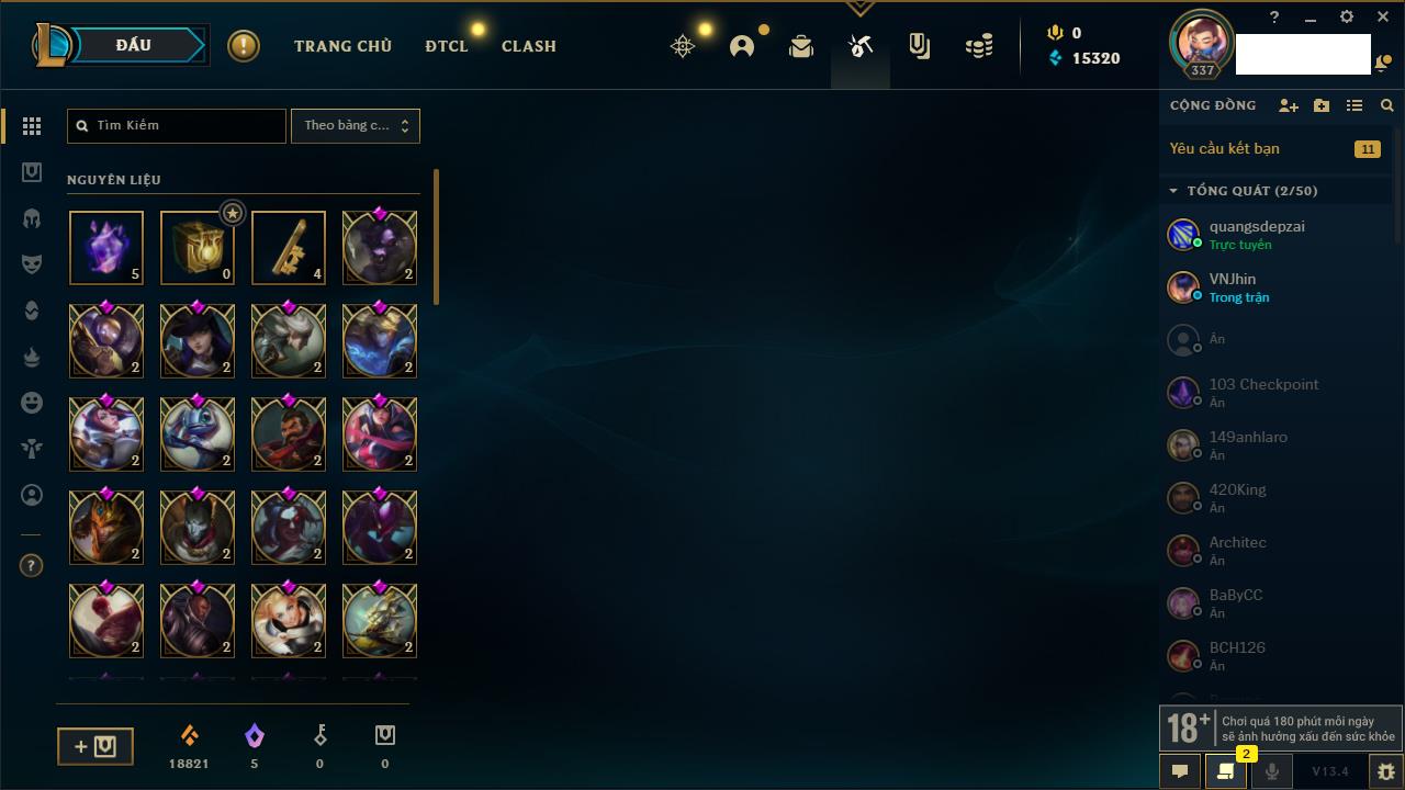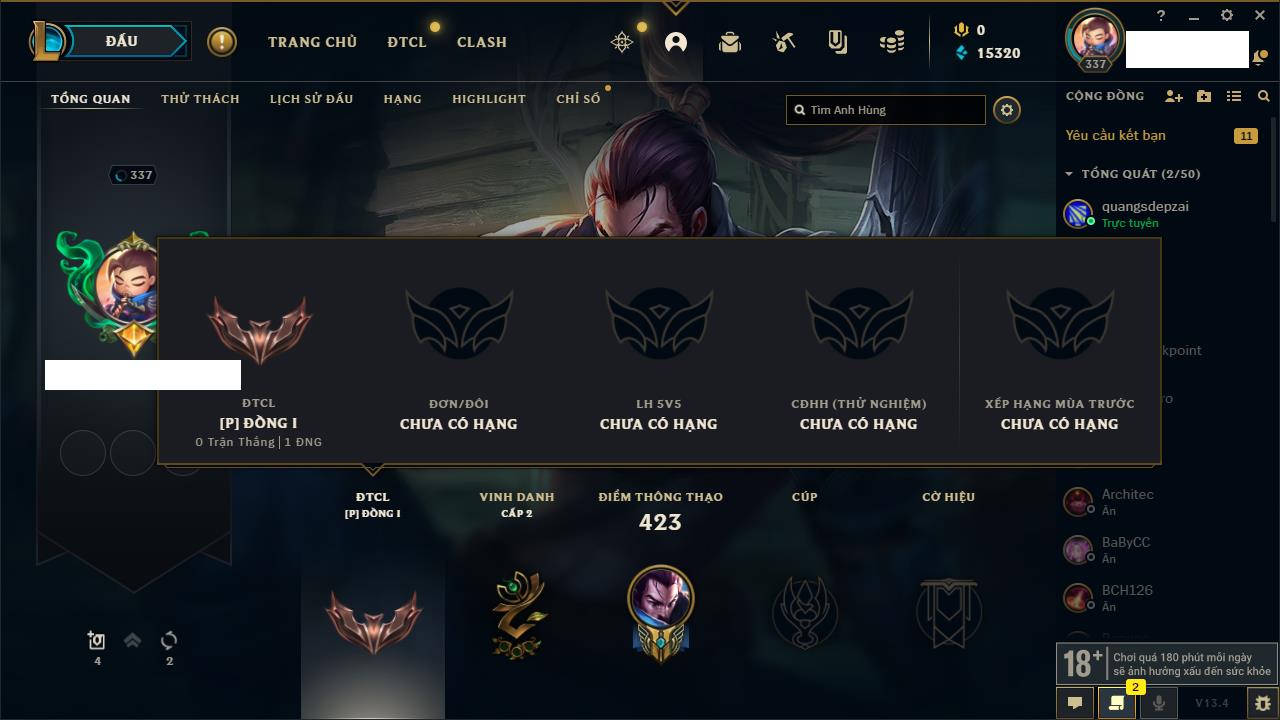Rank Đơn: Vàng IIIKhung: BạcTướng: 171 - Còn 101359 THXTrang Phục: 88Rank ĐTCL: Kim Cương IVLinh Thú: 200