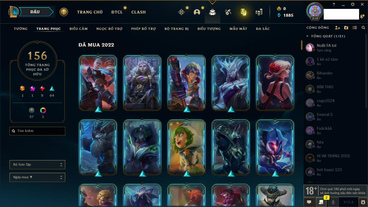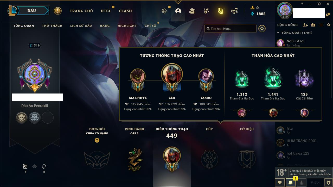 Rank Đơn: Chưa rank mùa nàoKhung: Chưa có khungTướng: 150 - Còn 4492 THXTrang Phục: 7Rank ĐTCL: Chưa RankLinh Thú: 14