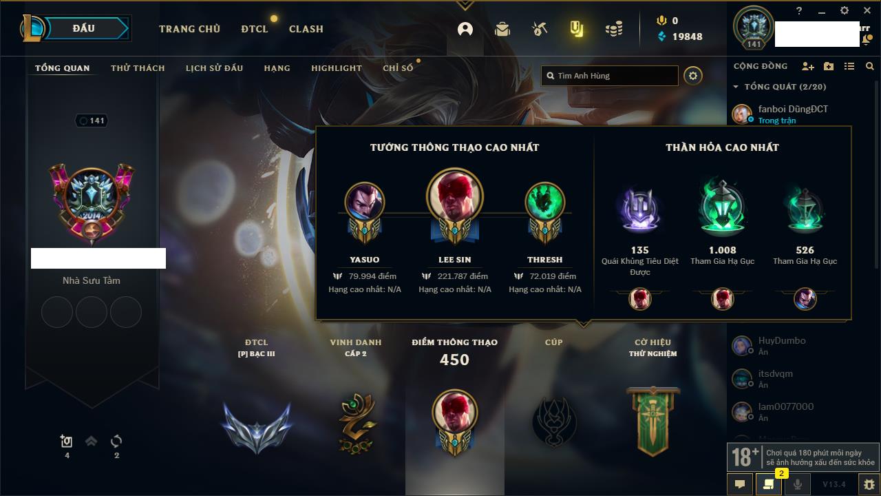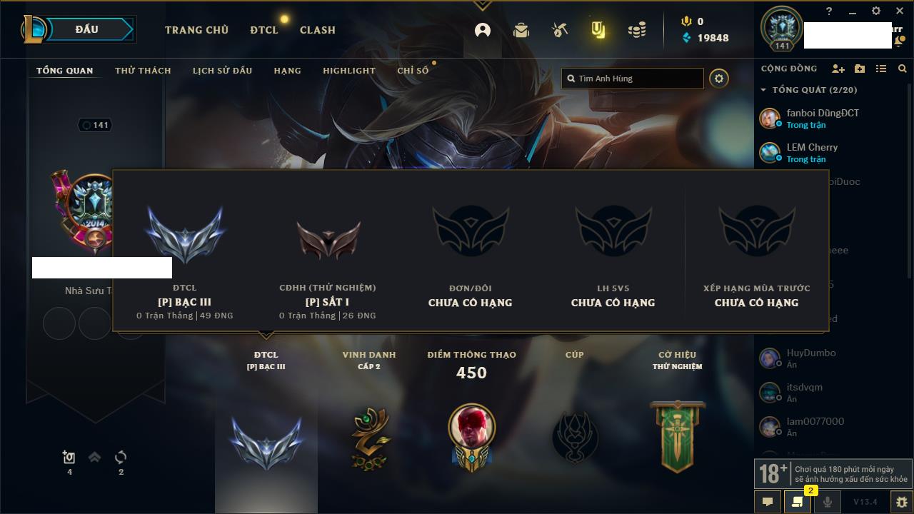 Rank Đơn: Chưa RankKhung: BạcTướng: 141 - Còn 299 THXTrang Phục: 101Rank ĐTCL: Chưa RankLinh Thú: 84
