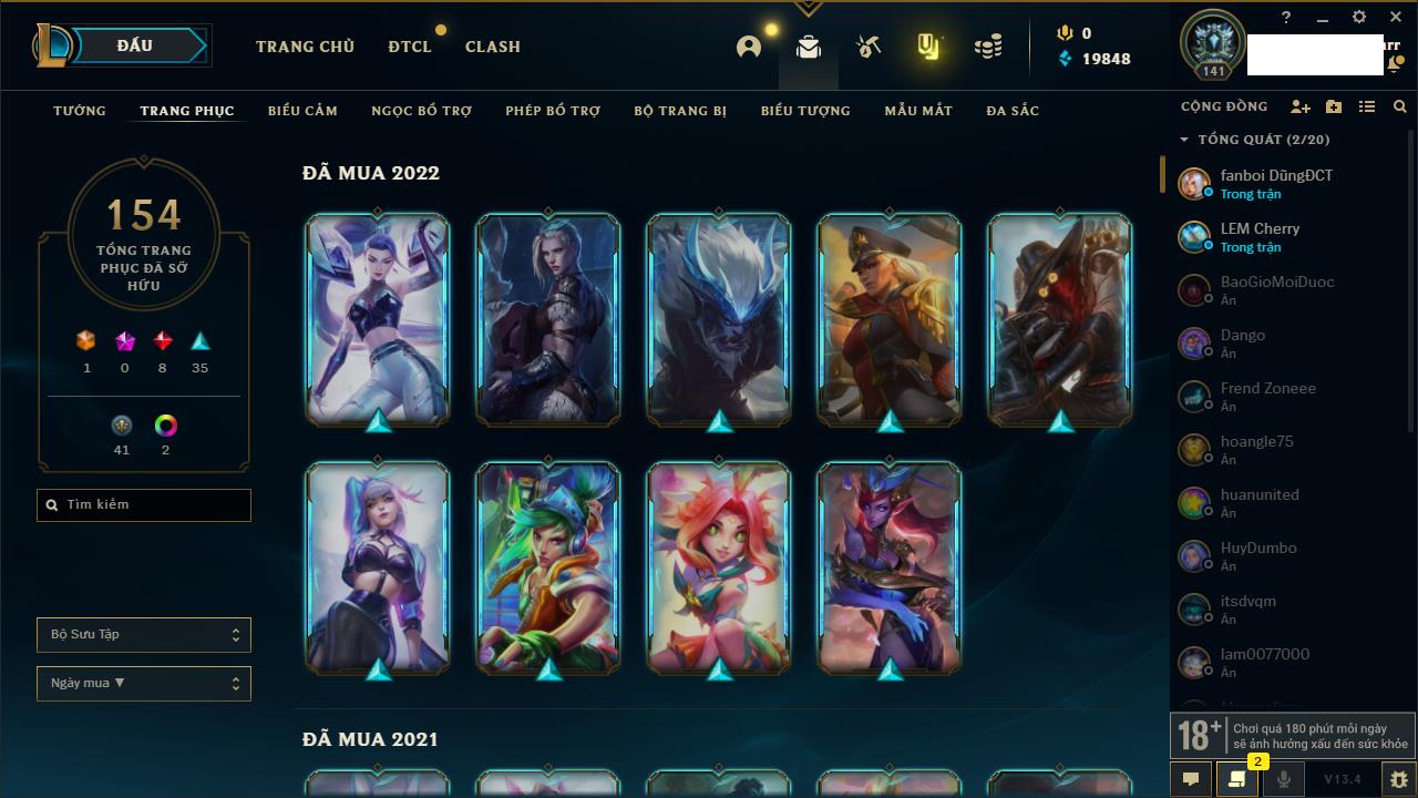 Rank Đơn: Chưa RankKhung: Chưa có khungTướng: 154 - Còn 18477 THXTrang Phục: 127Rank ĐTCL: Vàng ILinh Thú: 183