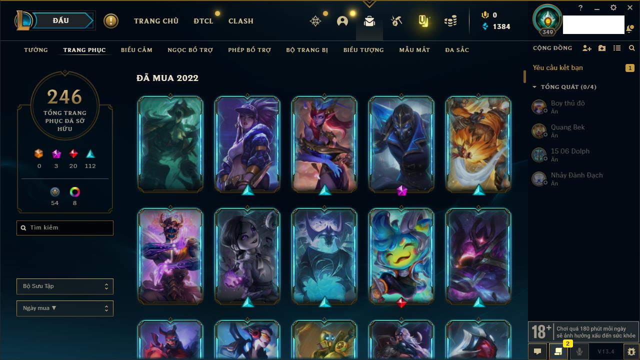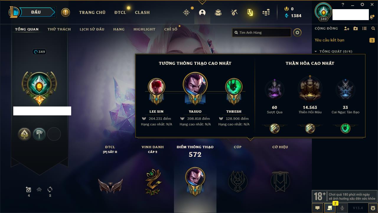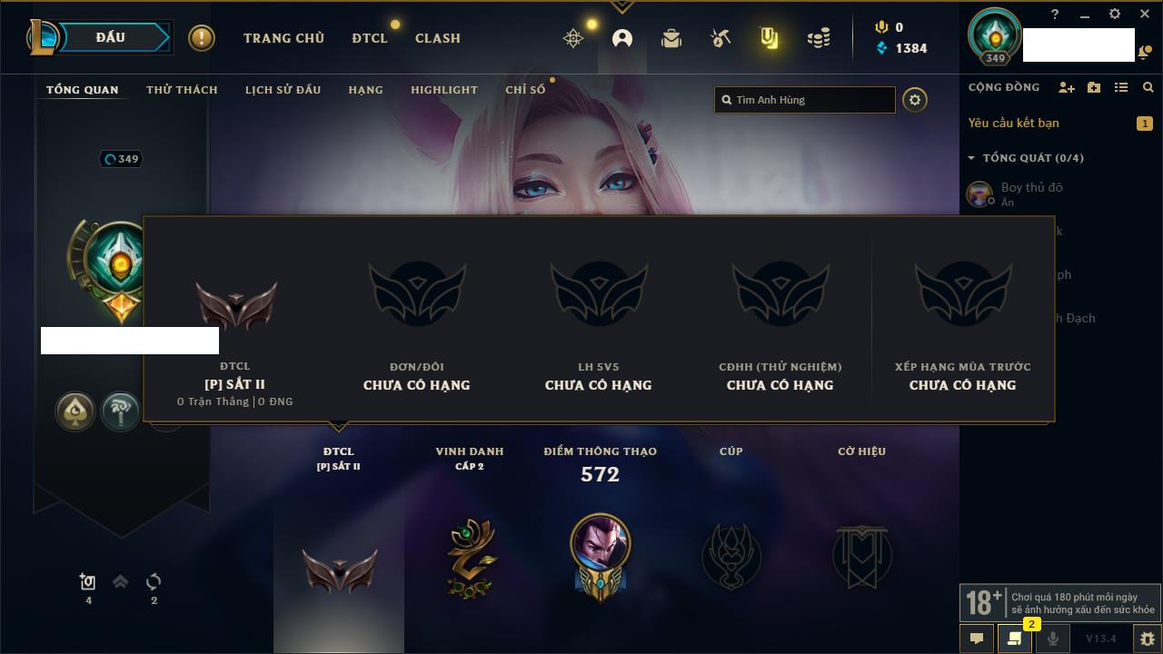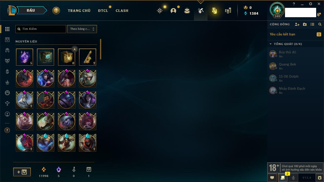 Rank Đơn: Bạc IIIKhung: BạcTướng: 171 - Còn 51045 THXTrang Phục: 220Rank ĐTCL: Sắt IILinh Thú: 141