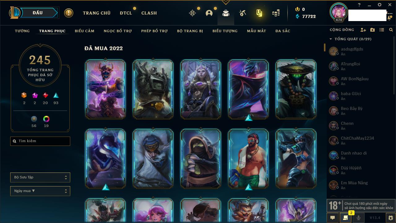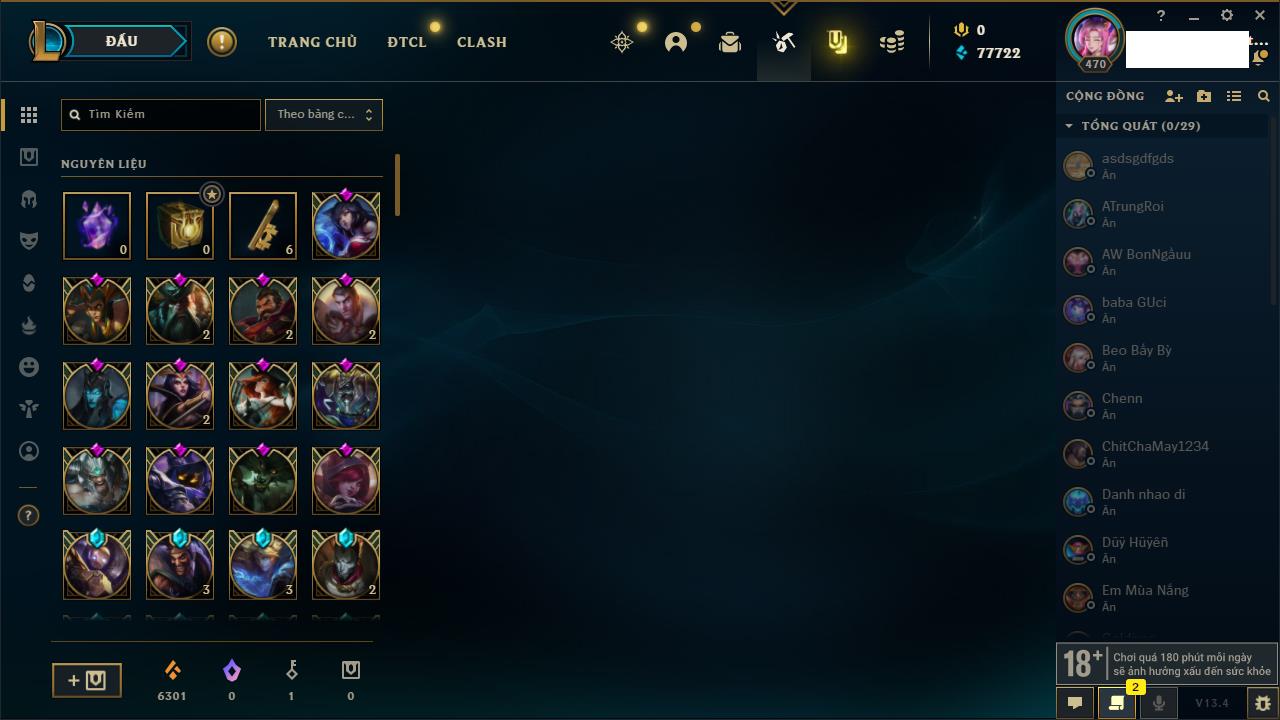 Rank Đơn: Vàng IIIKhung: BạcTướng: 171 - Còn 101359 THXTrang Phục: 88Rank ĐTCL: Kim Cương IVLinh Thú: 200