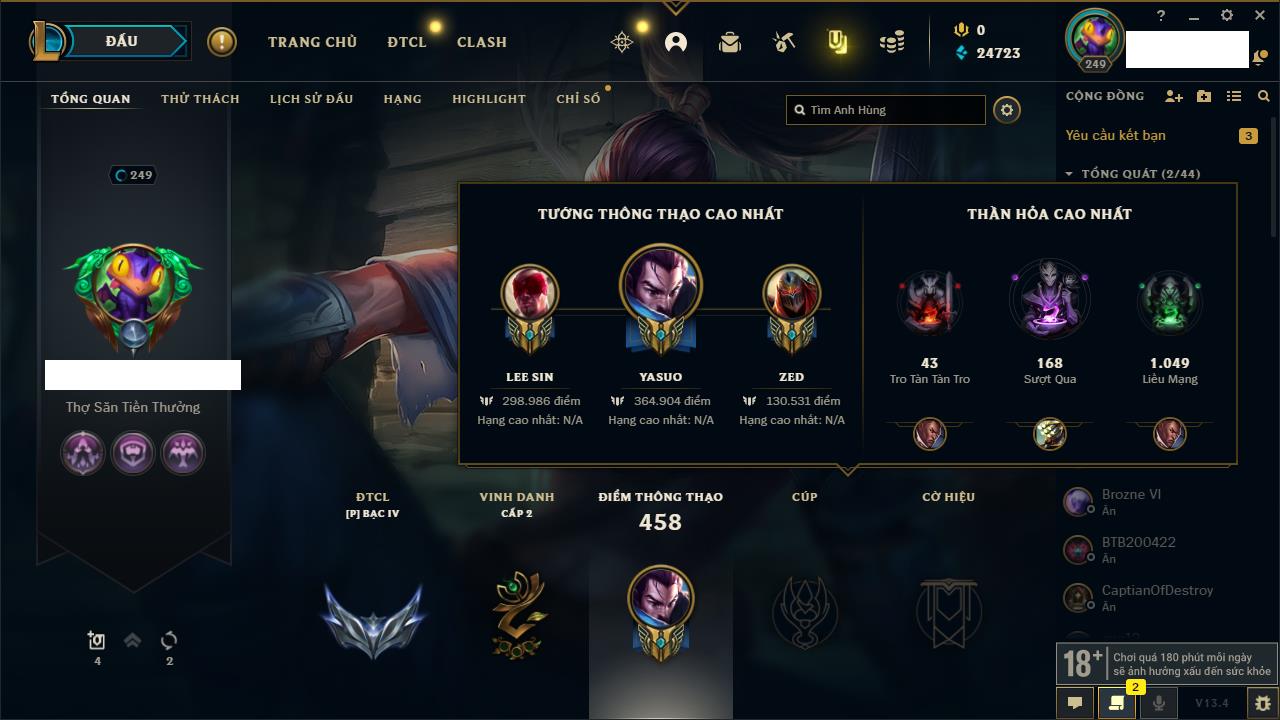 Rank Đơn: Vàng IVKhung: BạcTướng: 166 - Còn 180925 THXTrang Phục: 163Rank ĐTCL: Chưa RankLinh Thú: 67