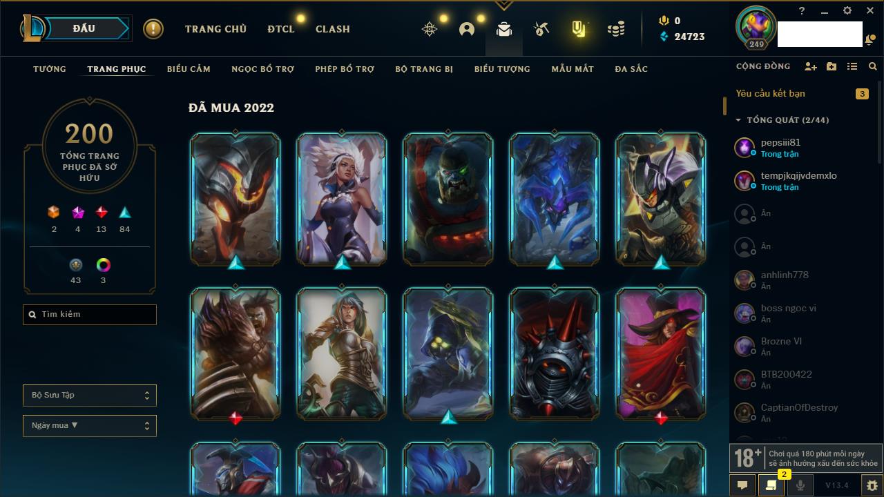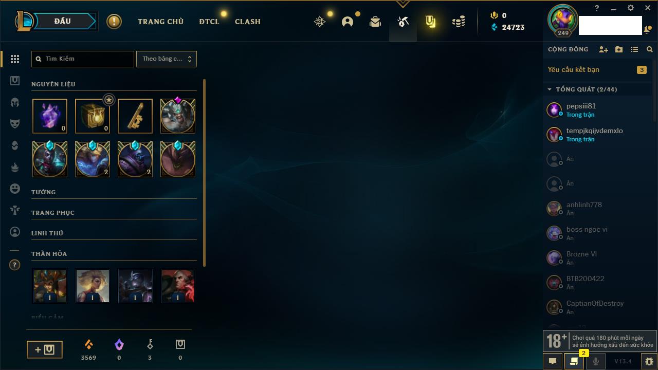 Rank Đơn: Vàng IVKhung: VàngTướng: 171 - Còn 48721 THXTrang Phục: 171Rank ĐTCL: Chưa RankLinh Thú: 27