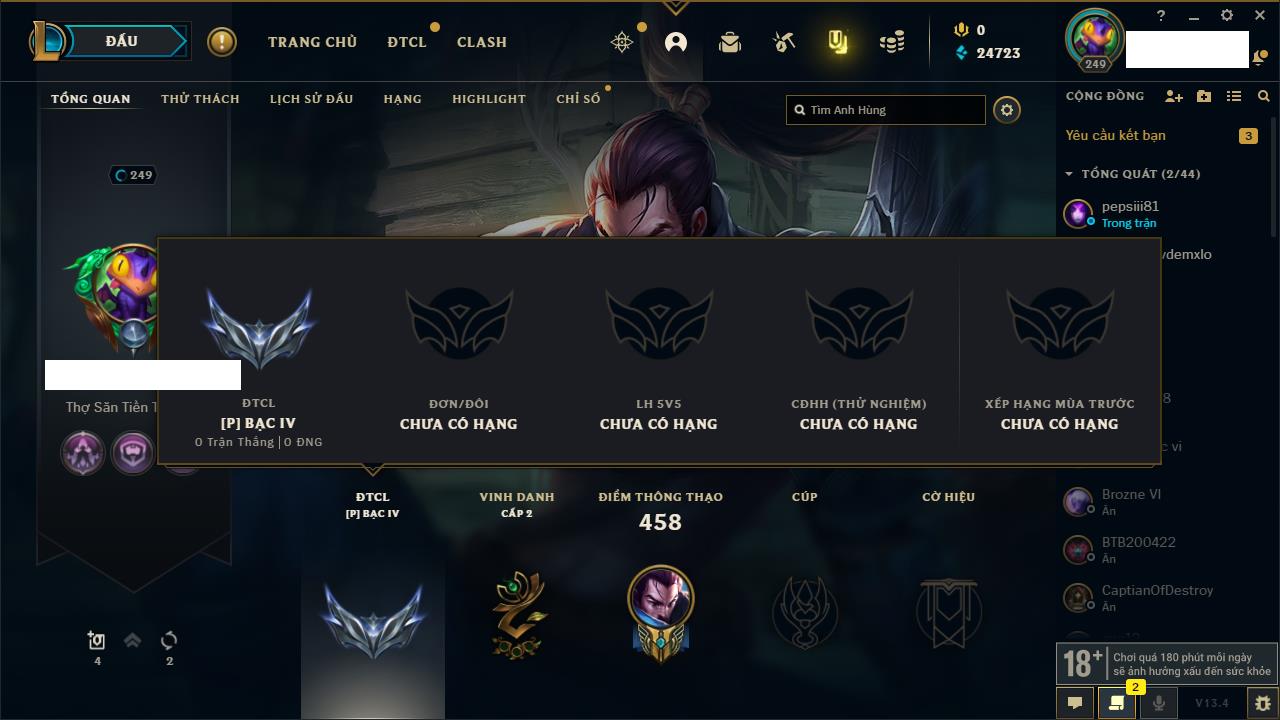 Rank Đơn: Bạc IIKhung: VàngTướng: 171 - Còn 332462 THXTrang Phục: 165Rank ĐTCL: Kim Cương IVLinh Thú: 181