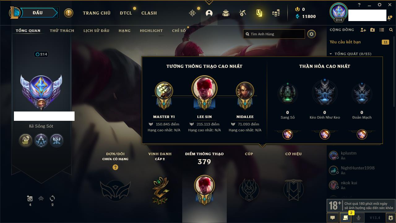 Rank Đơn: Chưa rank mùa nàoKhung: Chưa có khungTướng: 157 - Còn 12765 THXTrang Phục: 3Rank ĐTCL: Chưa RankLinh Thú: 78