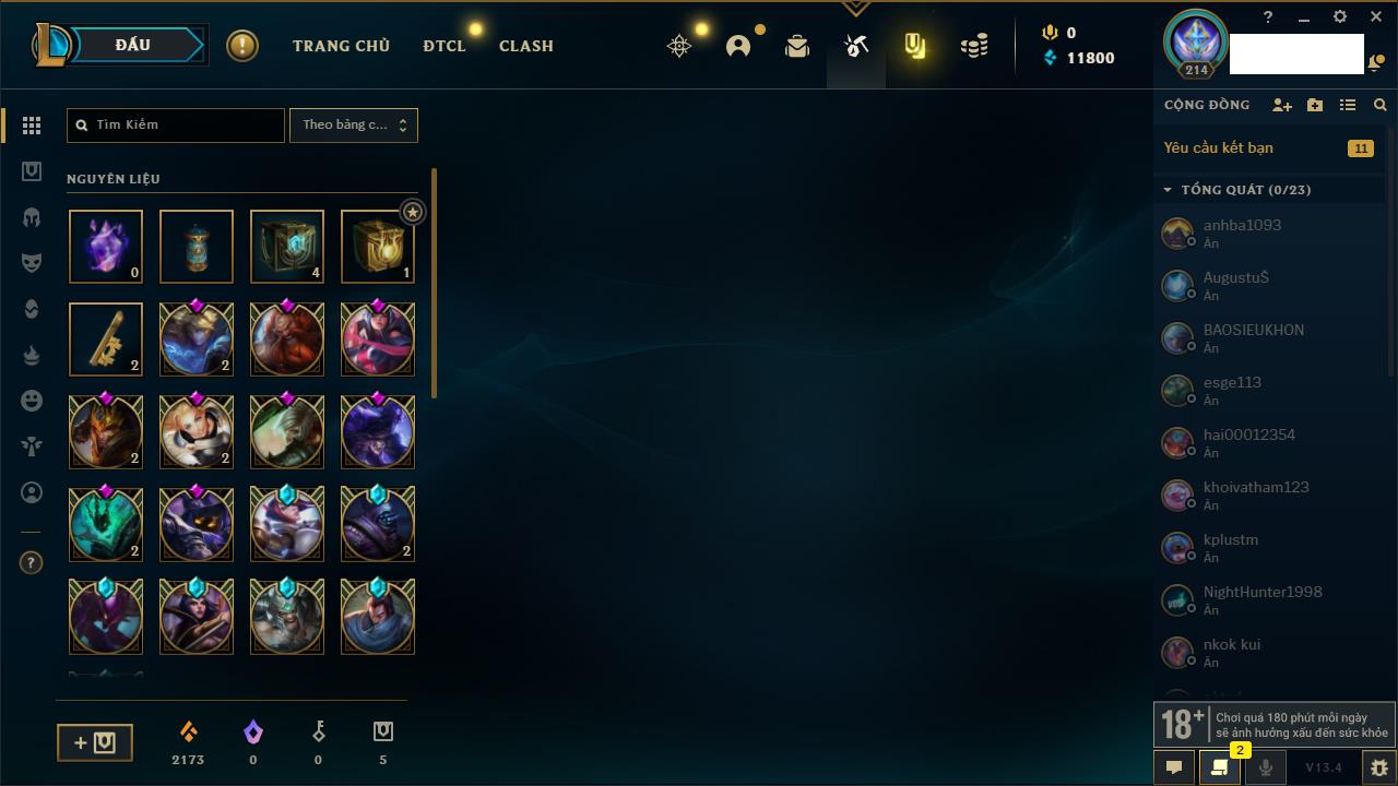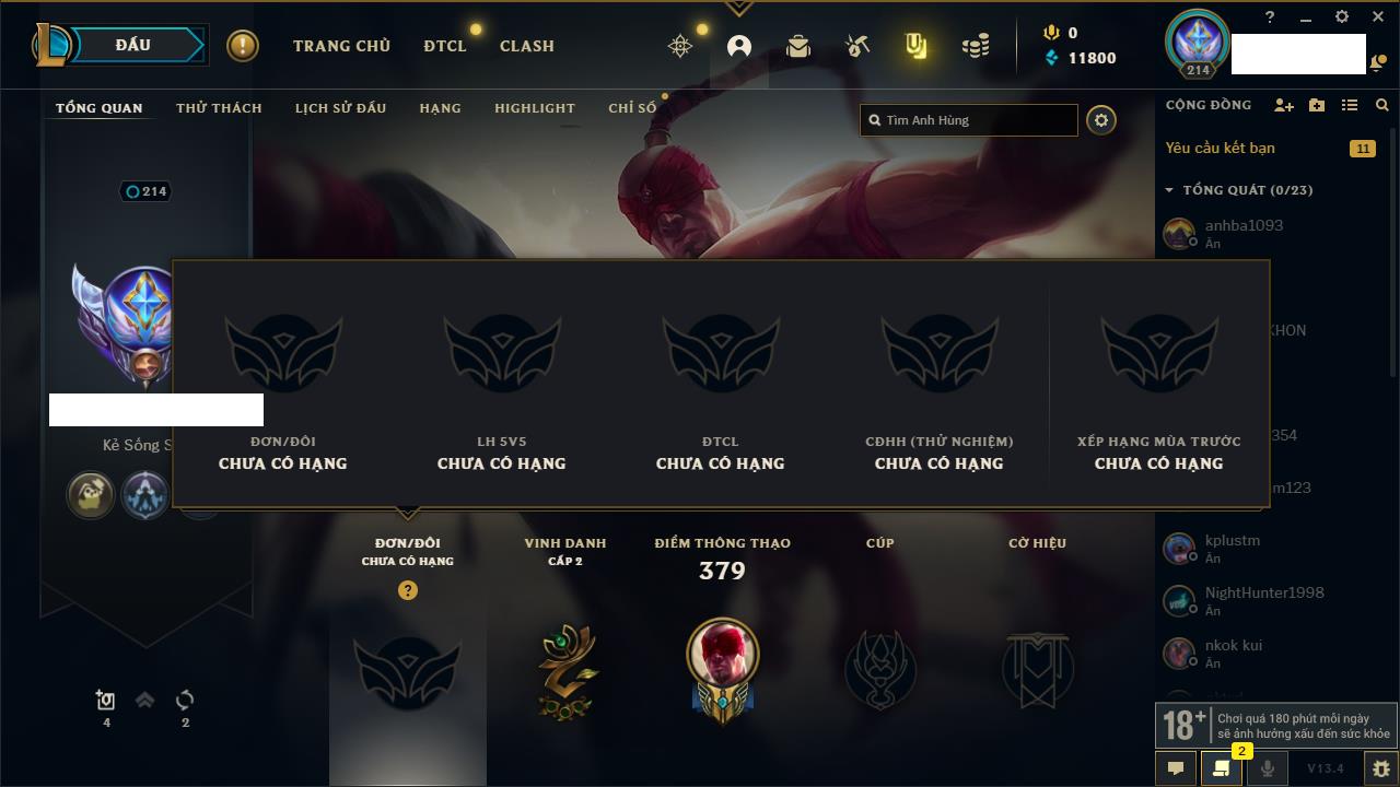 Rank Đơn: Sắt IIIKhung: Chưa có khungTướng: 63 - Còn 185 THXTrang Phục: 8Rank ĐTCL: Chưa RankLinh Thú: 75