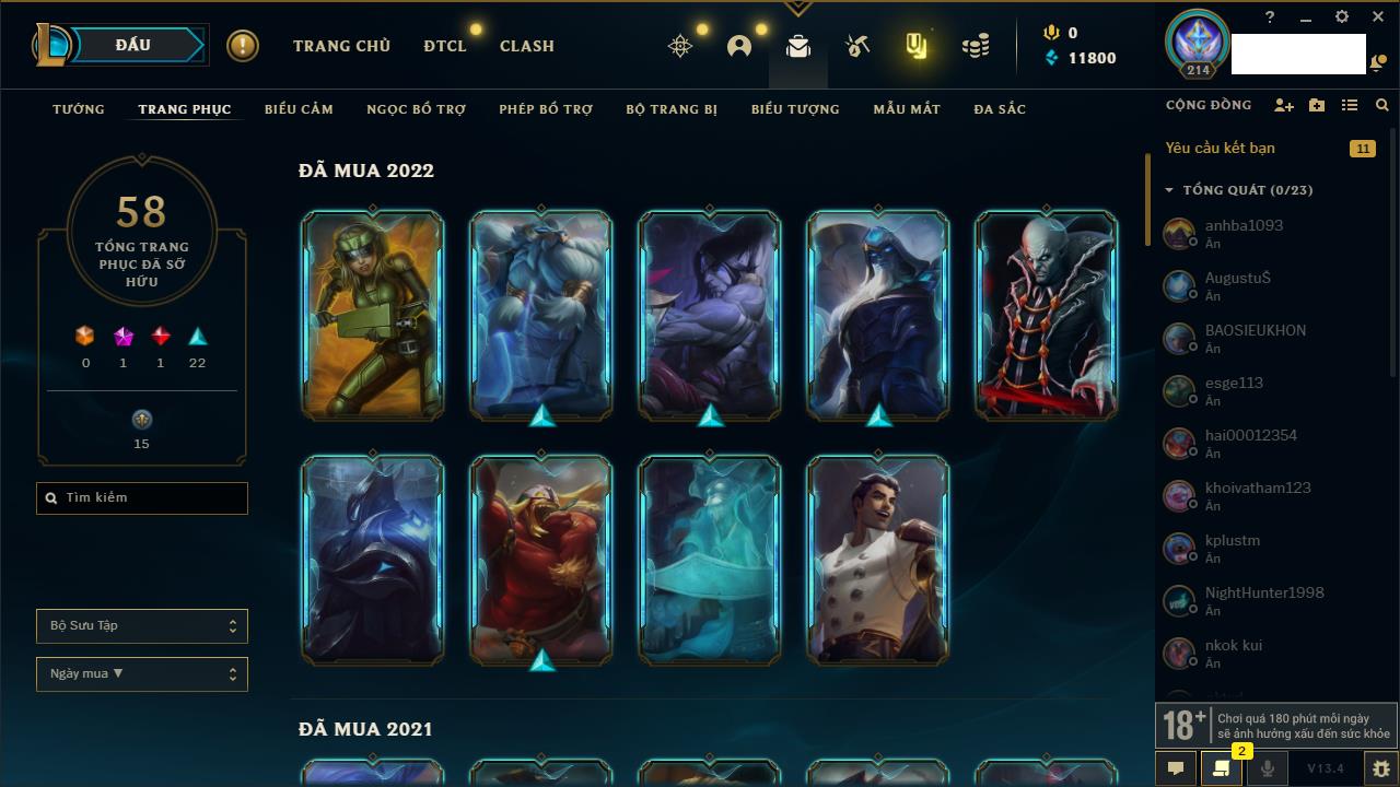 Rank Đơn: Chưa rank mùa nàoKhung: Chưa có khungTướng: 159 - Còn 1499 THXTrang Phục: 11Rank ĐTCL: Chưa RankLinh Thú: 81