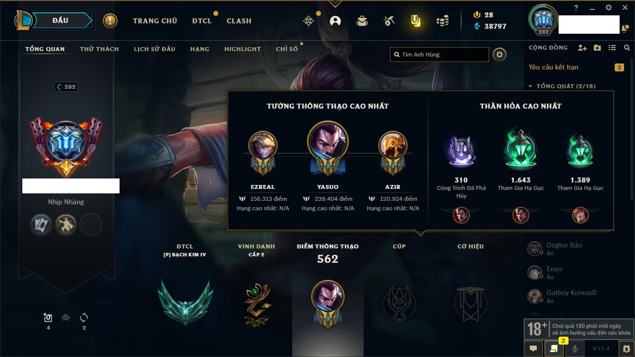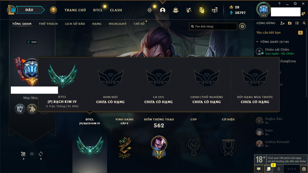 Rank Đơn: Vàng III Khung: Vàng Tướng: 171 - Còn 91047 THX Trang Phục: 98 Rank ĐTCL: Bạch Kim IV Linh Thú: 281