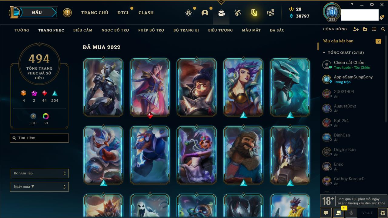 Rank Đơn: Chưa rank mùa nào Khung: Chưa có khung Tướng: 18 - Còn 21345 THX Trang Phục: 2 Rank ĐTCL: Vàng II Linh Thú: 14