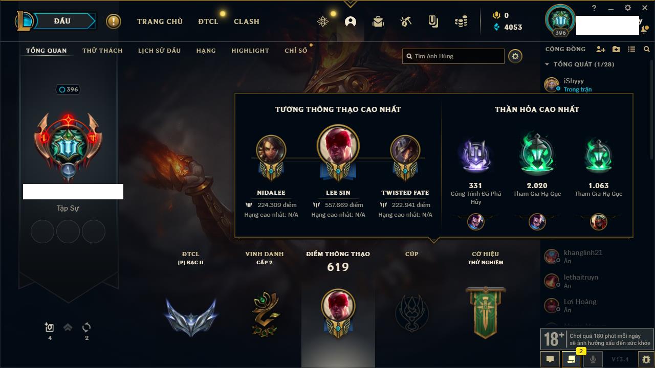Rank Đơn: Sắt IKhung: Chưa có khungTướng: 171 - Còn 89600 THXTrang Phục: 513Rank ĐTCL: Chưa RankLinh Thú: 57