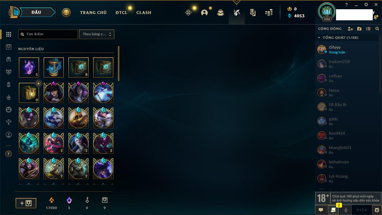 Rank Đơn: Chưa RankKhung: Chưa có khungTướng: 170 - Còn 72514 THXTrang Phục: 202Rank ĐTCL: Chưa RankLinh Thú: 191