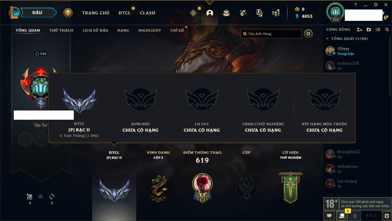 Rank Đơn: Chưa rank mùa nàoKhung: Chưa có khungTướng: 1 - Còn 3000 THXTrang Phục: 0Rank ĐTCL: Vàng ILinh Thú: 6