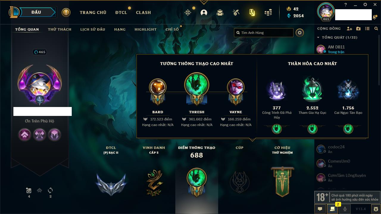 Rank Đơn: Chưa rank mùa nàoKhung: Chưa có khungTướng: 170 - Còn 58674 THXTrang Phục: 32Rank ĐTCL: Bạch Kim IIILinh Thú: 299