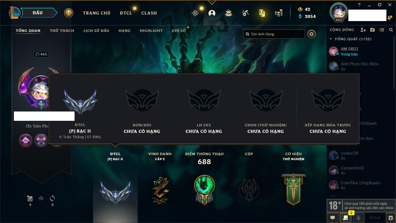 Rank Đơn: Chưa rank mùa nàoKhung: Chưa có khungTướng: 1 - Còn 3000 THXTrang Phục: 0Rank ĐTCL: Vàng ILinh Thú: 6