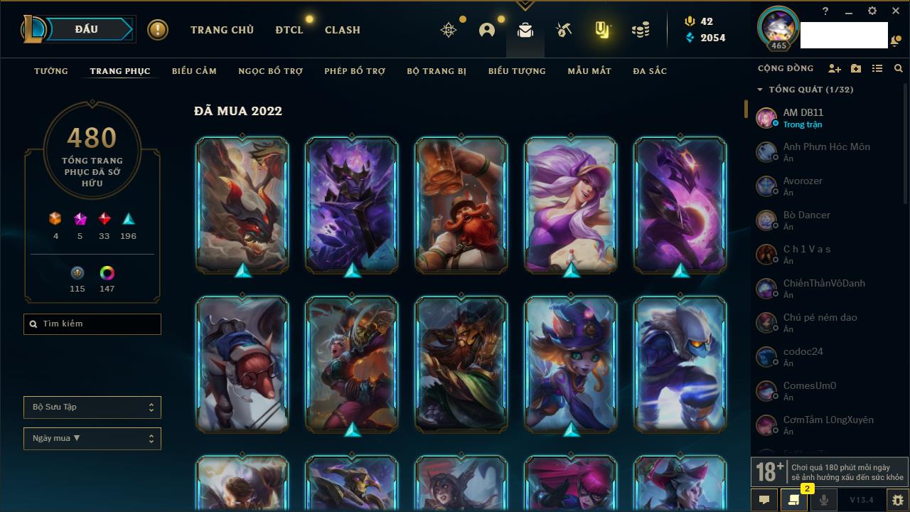Rank Đơn: Vàng IVKhung: VàngTướng: 172 - Còn 530040 THXTrang Phục: 251Rank ĐTCL: Chưa RankLinh Thú: 70