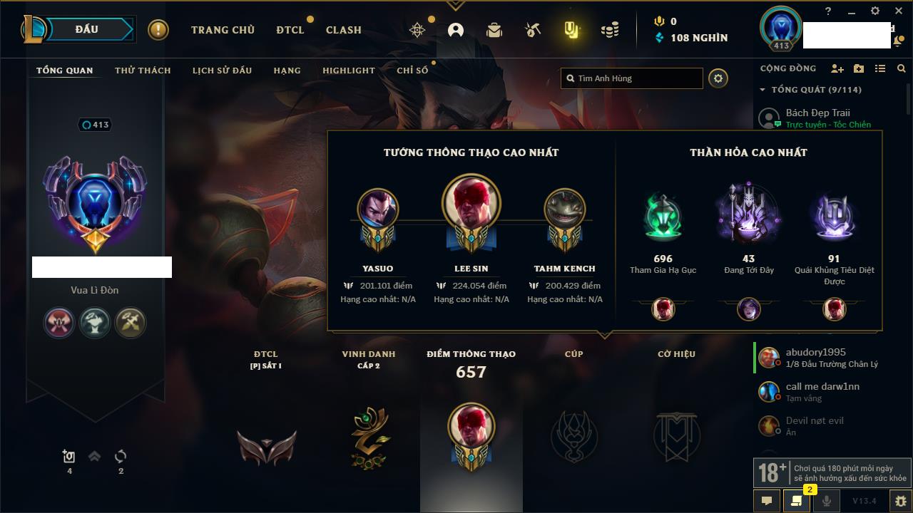 Rank Đơn: Sắt IKhung: Chưa có khungTướng: 171 - Còn 89600 THXTrang Phục: 513Rank ĐTCL: Chưa RankLinh Thú: 57